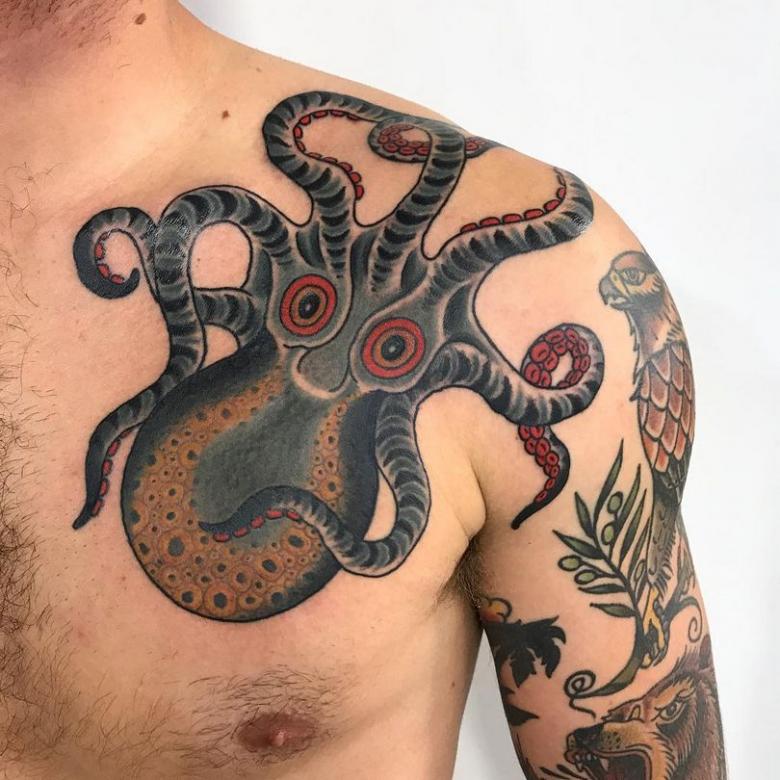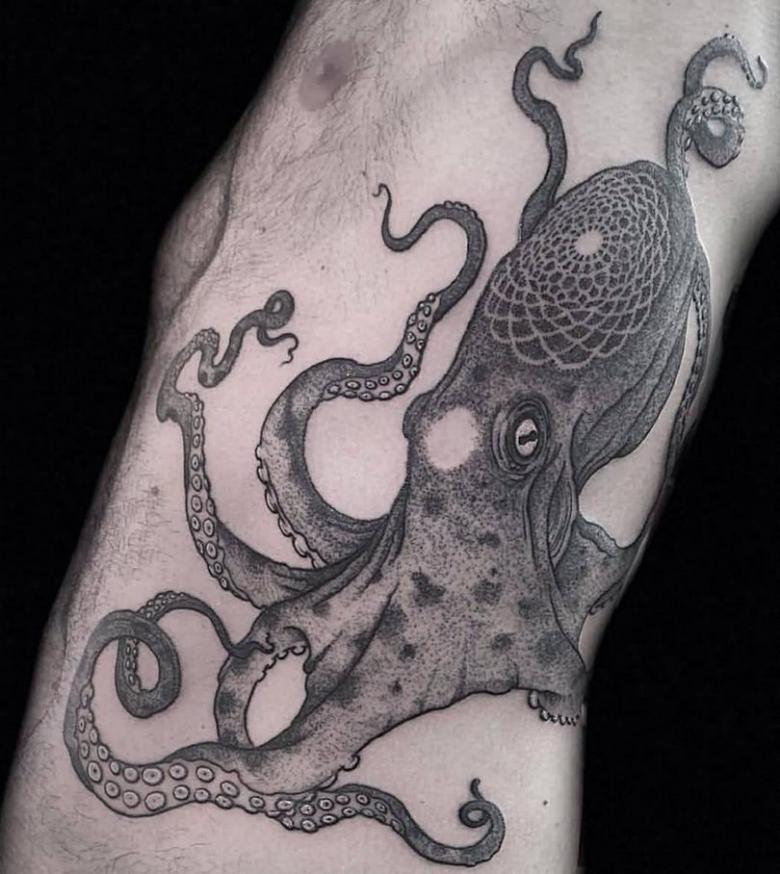 このようにタコは、持ち主の逞しさ、人生のチャレンジ精神、鋭い洞察力、強い意志を示すことができるのです。背中や肩、胸など、モノクロで大きく目立つものが多く、脚の場合は少ない。