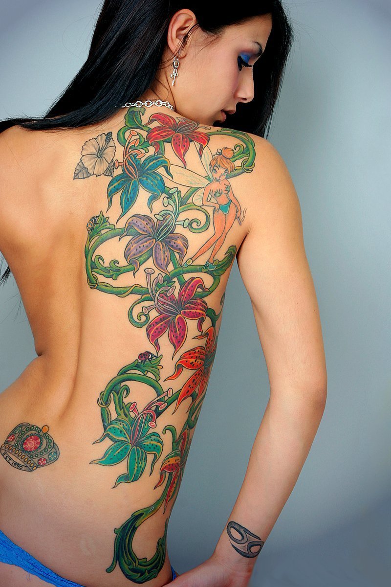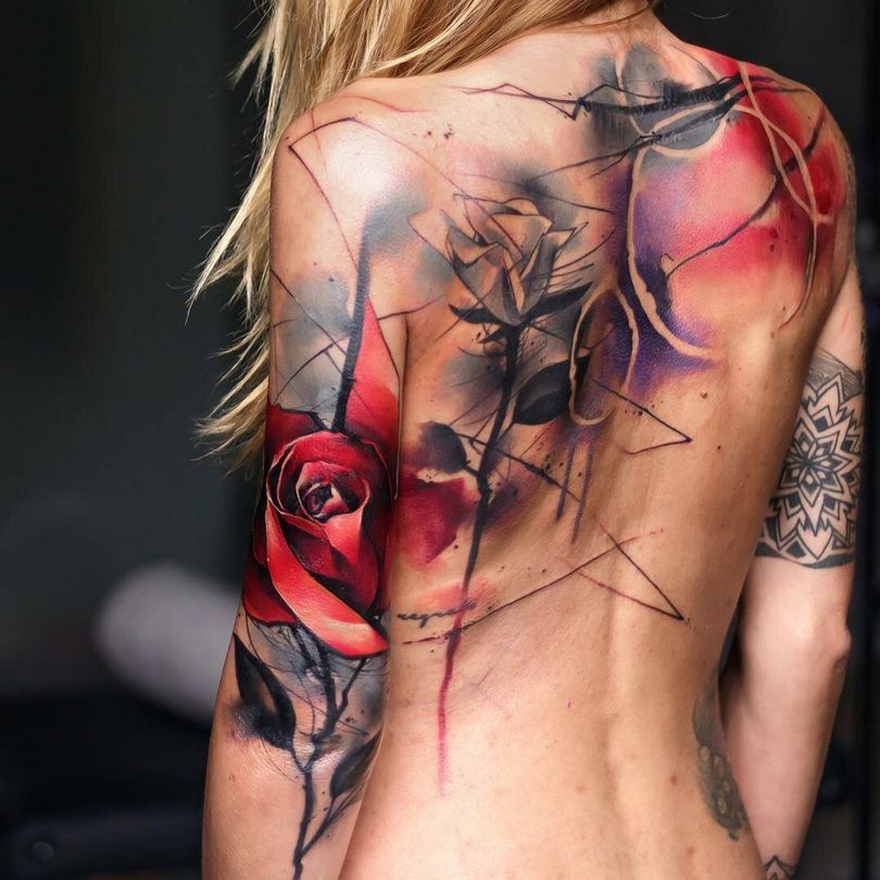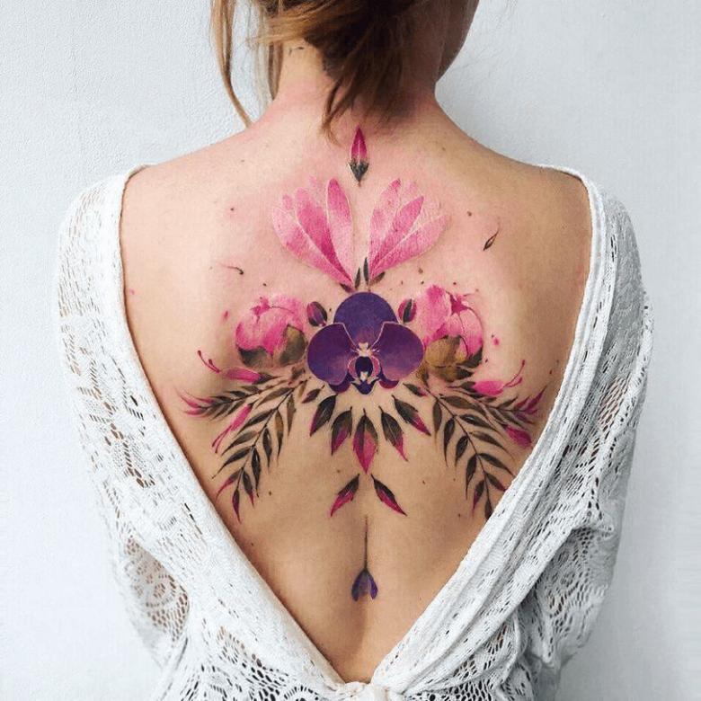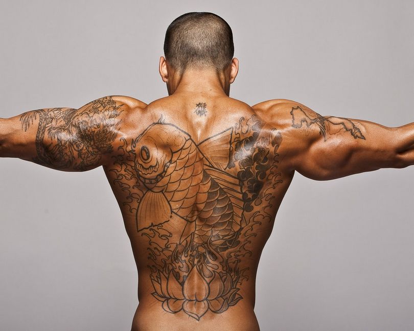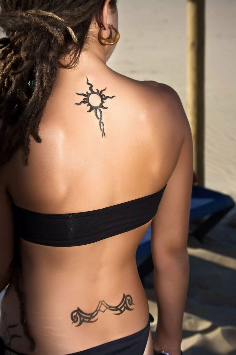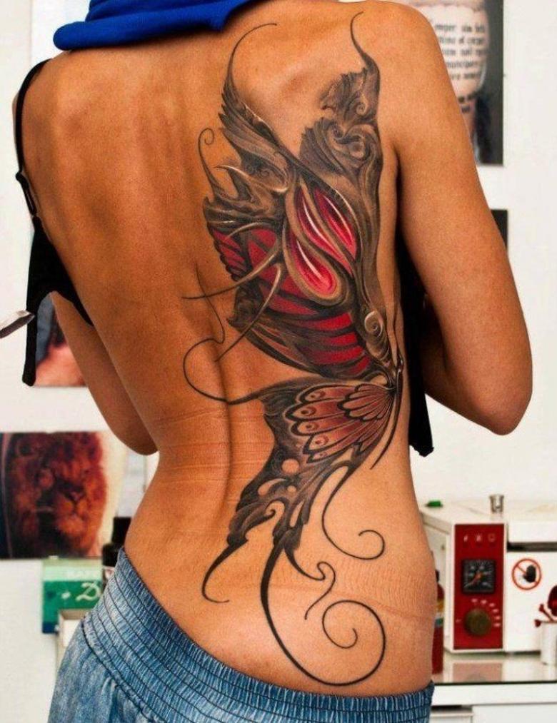 Ici, vous pouvez faire des tatouages à grande échelle et des tatouages de tracé. Beaucoup d'espace pour travailler. Il n'est pas difficile de cacher le tatouage des regards indiscrets. Il y a une nuance, l'image au dos du propriétaire ne pourra pas être admirée en permanence.
