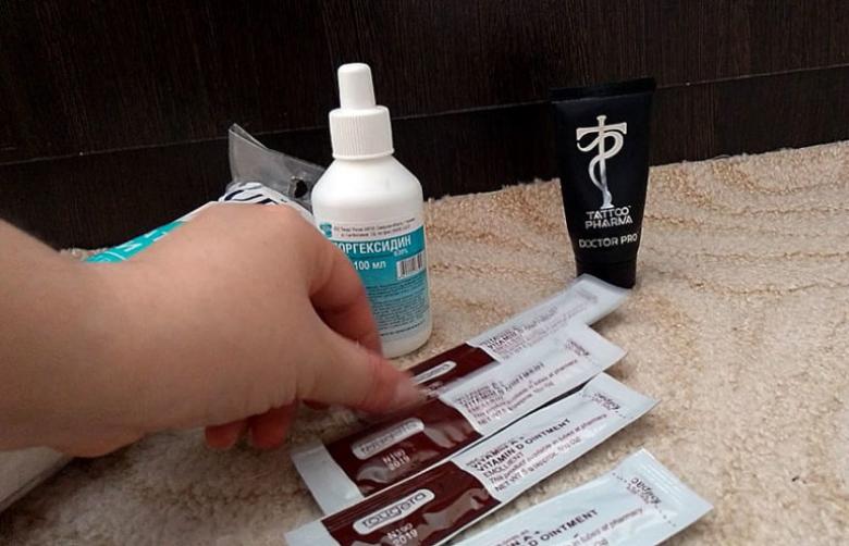 - Un traitement régulier de la zone enflammée est nécessaire. La chlorhexidine est excellente pour cela, imbibez-en un coton et tamponnez doucement le tatouage (3-4 fois par jour) ;