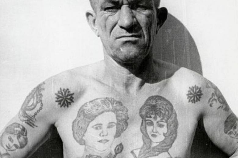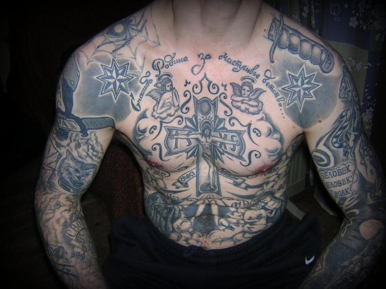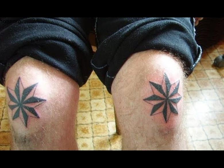 Le premier est ...les étoiles des voleurs.... Aujourd'hui, ce type de tatouage peut même se retrouver sur des filles fragiles. Les étoiles à huit branches se trouvent généralement sur les clavicules ou les genoux et indiquent que leur propriétaire est un voleur de loi. Si le tatouage est "juste pour le plaisir" et n'a aucune signification, il y a un prix à payer en prison. Le porteur sera contraint de faire enlever le tatouage par tous les moyens nécessaires.