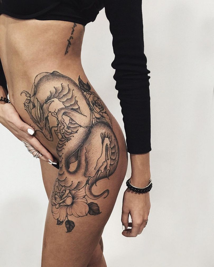 Cette partie du corps n'est pas si douloureuse, c'est pourquoi cette partie du corps est populaire auprès des filles. Les roses rouges, qui symbolisent l'amour sincère, la beauté intemporelle et la jeunesse, sont souvent inscrites sur les cuisses. On y trouve aussi souvent des motifs de style ancien et une variété d'imprimés. Tout semble mignon et sexy sur les courbes séduisantes d'une femme.