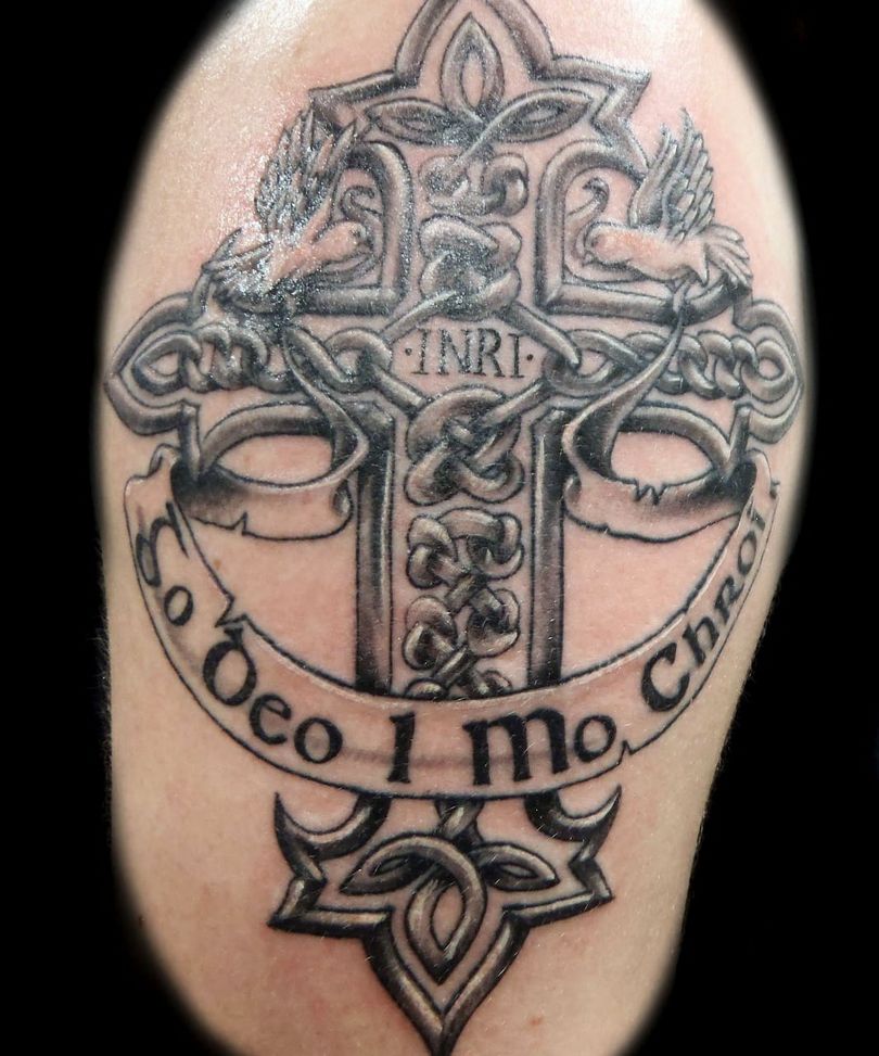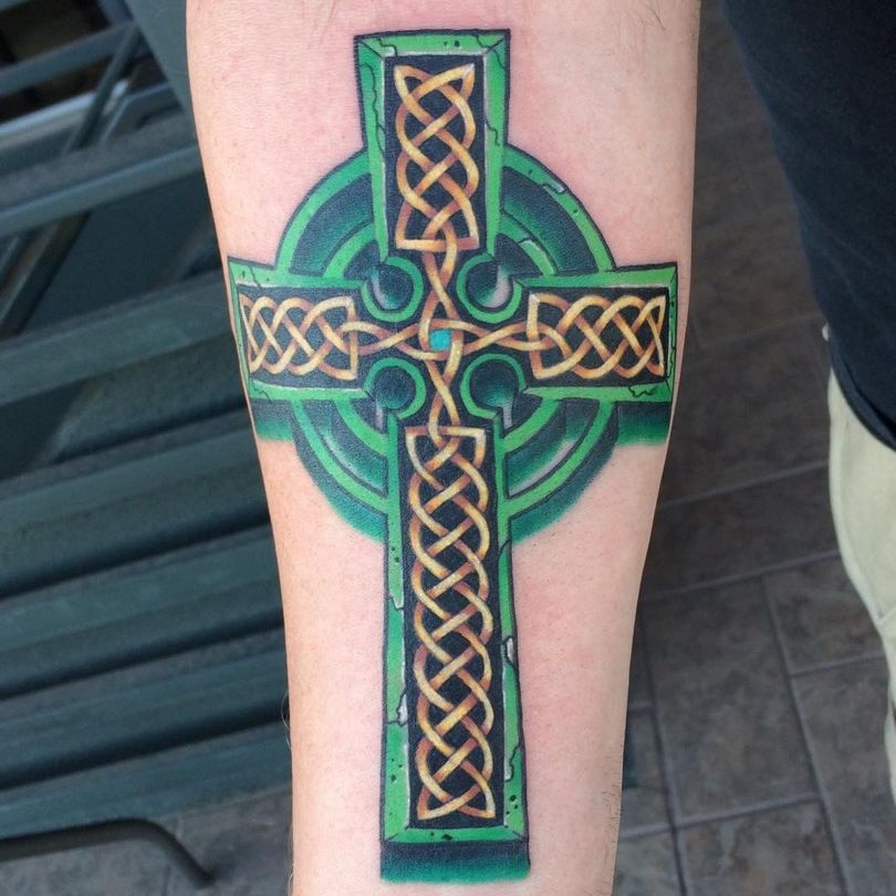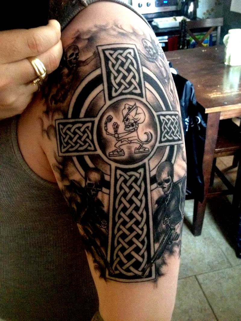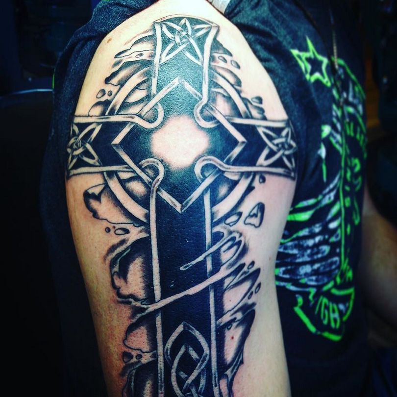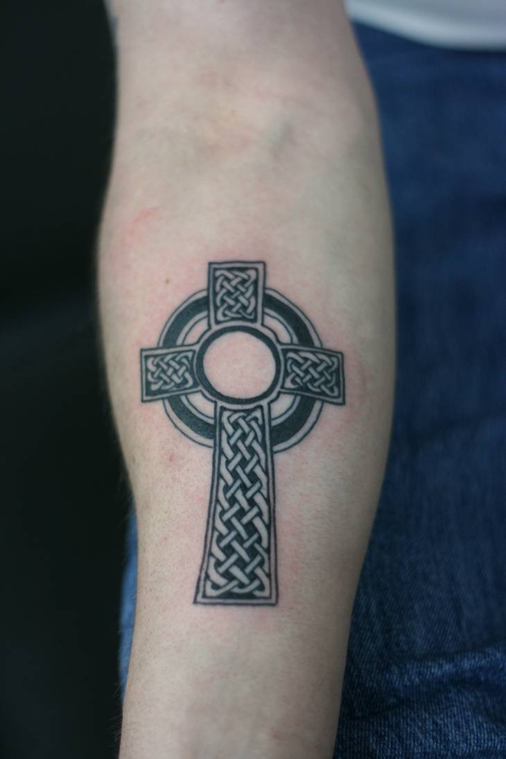 Keltų kryžiaus tatuiruotė - išsamus aprašymas, taikymo vieta (ant rankos, riešo, peties), įdomūs dizainai ir nuotraukos