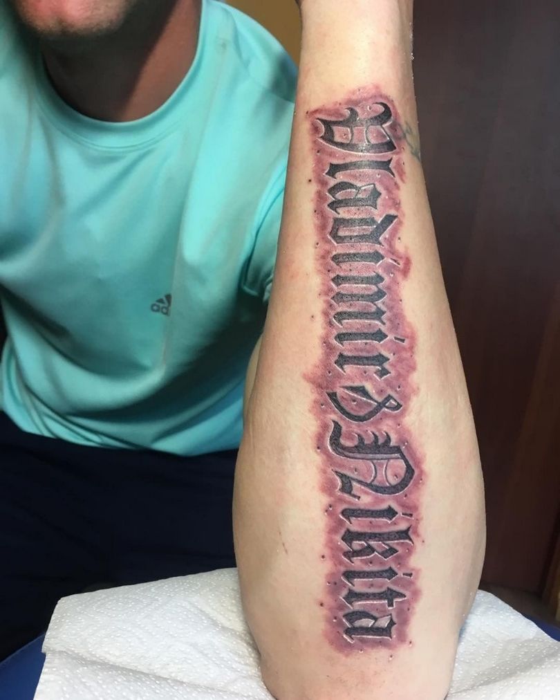 L'inscription en allemand semble brutale. Le texte en anglais sera compréhensible pour la plupart des observateurs. Les inscriptions espagnoles sont pleines de passion brûlante, tandis que les dictons français respirent l'air de Paris. Les lettres italiennes sont frappantes ; les hiéroglyphes et les ligatures indiennes peuvent plonger le spectateur dans une transe philosophique. Il faut être très prudent avec le texte, tant au niveau du contenu que du remplissage, car le moindre faux pas fera du propriétaire du tatouage un objet de moquerie de la part des étrangers.