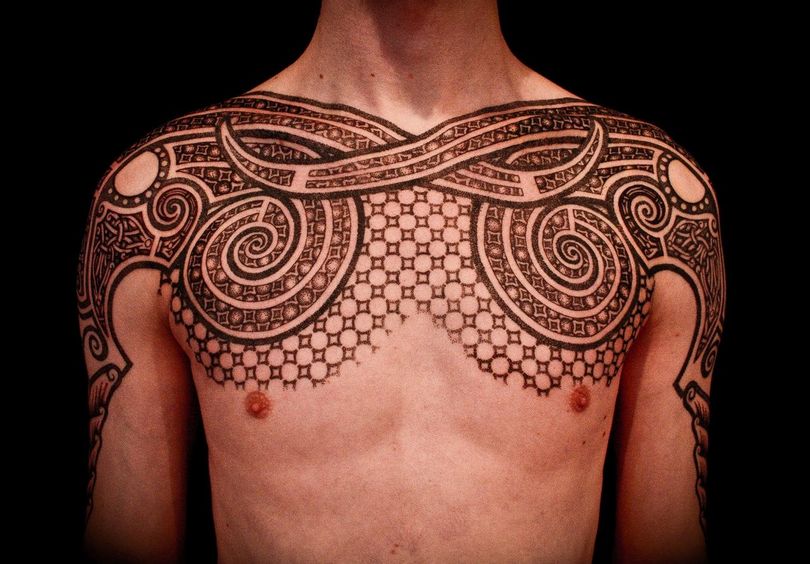 - Ķelti un mūsdienu angļu senči. Baltās līnijas melnā krāsā. No tiem ir viegli izcelt trīsdimensiju un atpazīstamus stāstus - koku vai Tora āmuru. Nereti tur ir sirds un krusts. Runājot par nozīmēm, runa ir par bezlaika pirmsākumiem, zemes un debess kā augšējās un apakšējās pasaules simboliem. Mezgls iezīmē vienotības tēmu starp ķermeni un garīgo komponentu. Nereti uz ķermeņa var redzēt tetovējumus ar savstarpēji savītiem simboliem, kas veido aproces un gredzenus.