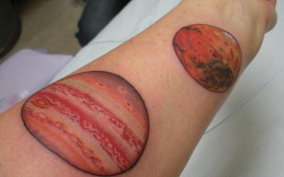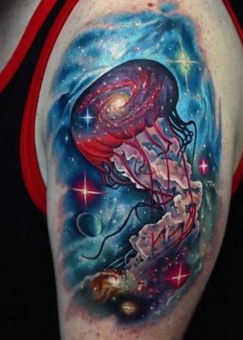 Ce tatouage inspiré de l'espace présente des étoiles, des planètes et un trou noir sur un parapluie en forme de méduse. Ce tatouage peut signifier l'excitation, l'espoir et la liberté d'esprit. Comme d'autres tatouages de méduses, il signifie également protection, force, harmonie, immortalité, tranquillité et confiance. Une méduse cosmique est mieux tatouée sur les personnes calmes, fortes, intelligentes et perspicaces. Ce tatouage est également idéal pour ceux qui sont fascinés par le thème de l'espace infini.