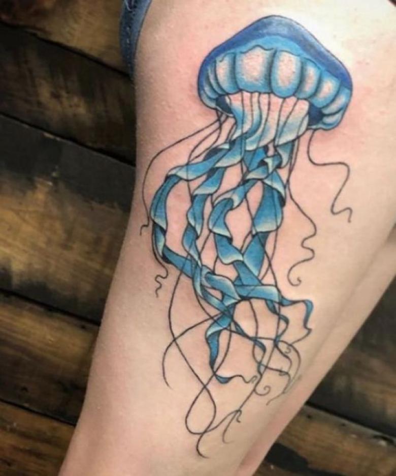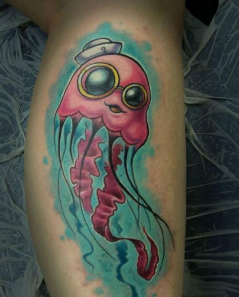 Une méduse drôle et hilarante réalisée dans un style cartoon. La signification de ce tatouage peut être résumée par le désir de son propriétaire de toujours rester un enfant de cœur, malgré son âge réel. De toute évidence, il s'agit d'un tatouage plutôt audacieux en raison de sa luminosité et de son caractère cartoonesque. Naturellement, il convient mieux aux membres du beau sexe.