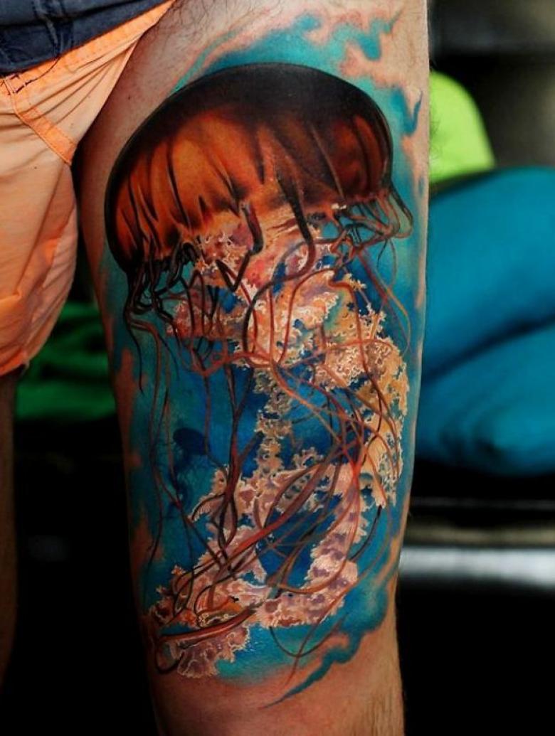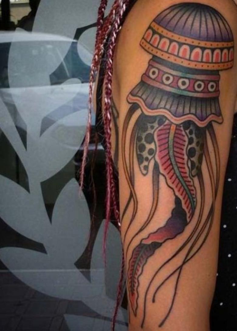 Ce tatouage est réalisé dans technique de réalismePar conséquent, l'image de la méduse semble réelle, tridimensionnelle. Par conséquent, la signification du tatouage peut être celle de quelque chose de vivant, en mouvement, actif. Ce tatouage devrait être attribué à des personnes fortes, intelligentes, ayant de l'estime pour elles-mêmes et des convictions bien ancrées.