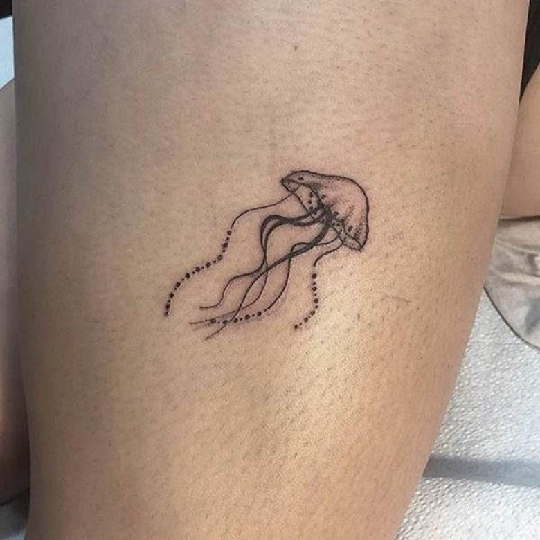 Ce que le tatouage de méduse sur cette photo signifie : légèreté, capacité de survie, simplicité et élégance. Le travail artistique est réalisé en Technique du pointwork en utilisant un grand nombre de points plutôt que de lignes. Le tatouage reflète le caractère du porteur, qui peut être sincère, vif et élégant.