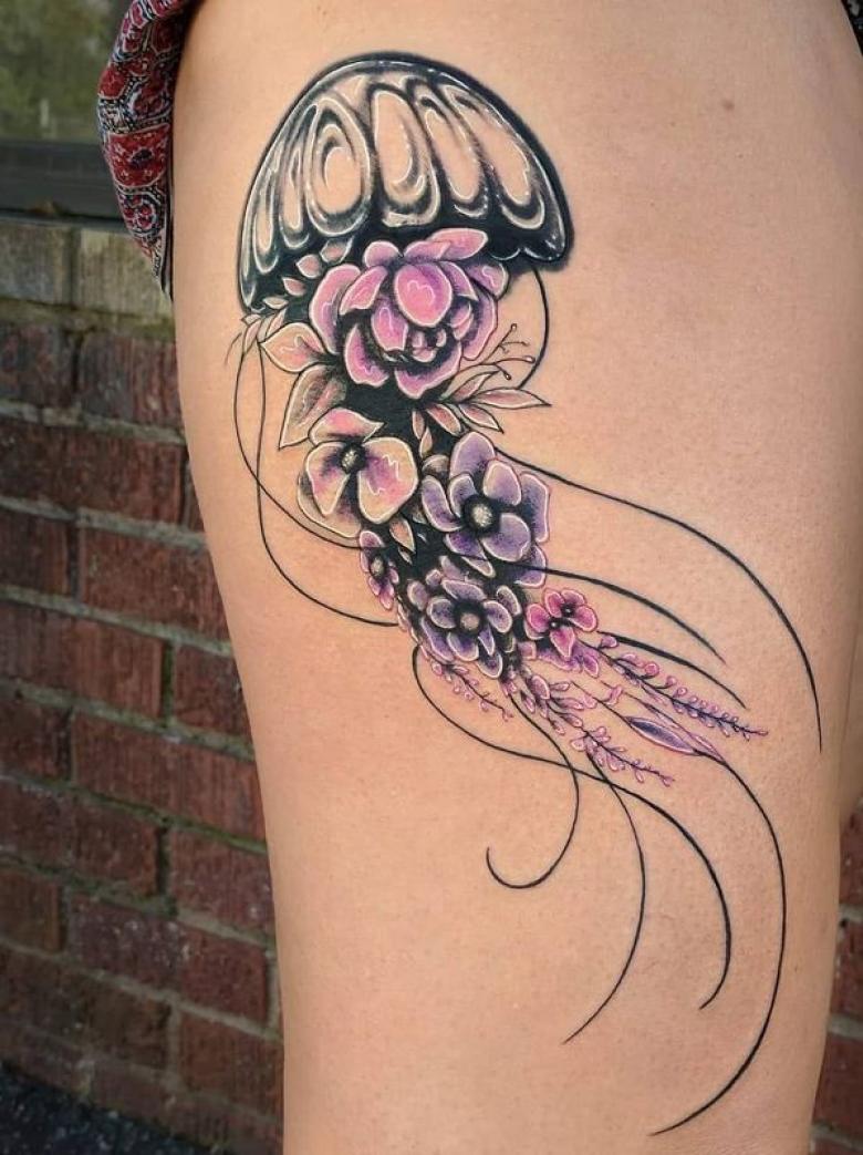 Un autre tatouage de méduse pour les filles est fait dans un beau style en utilisant des fleurs. Ce tatouage symbolise le contentement, le bonheur et tout ce qui peut être beau chez une femme. Ce tatouage brillant et spectaculaire sera une excellente décoration pour les filles confiantes et n'ayant pas peur du changement.