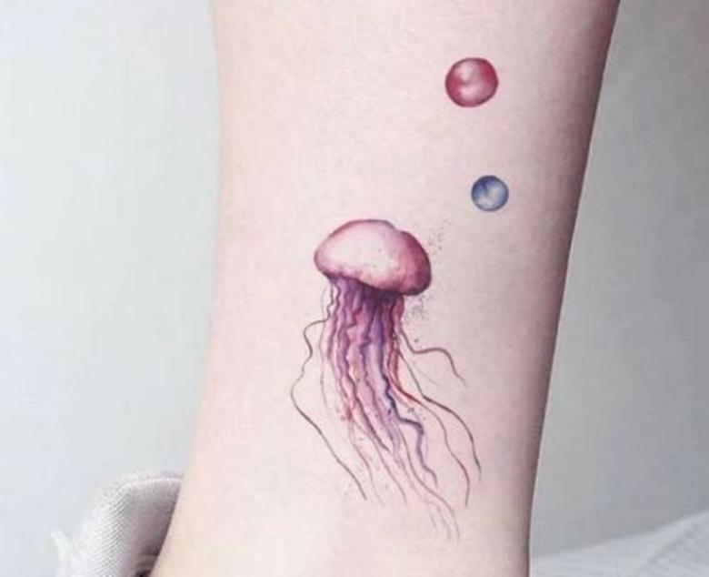 Ce tatouage de méduse convient mieux aux filles. Les bulles au-dessus de la méduse représentent la liberté, la détente et la chance. Les couleurs calmes du tatouage s'harmonisent avec la couleur de la peau et ne le font pas trop ressortir sur une partie du corps. La petite taille du tatouage permet de le dissimuler sous les vêtements, surtout si le tatouage sera imprimé sur la jambe, comme dans notre exemple.