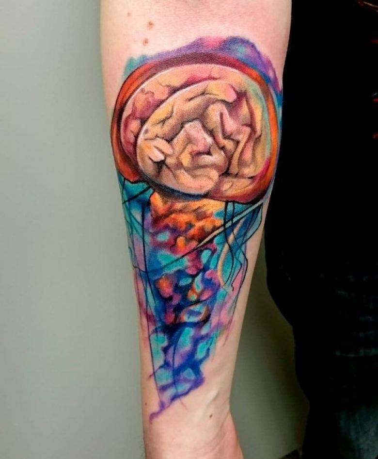 Un tatouage plutôt inhabituel qui représente un cerveau humain ayant la forme du sommet d'une méduse. Que signifie un tatouage de méduse avec un cerveau humain ? L'imagination ici peut être sans limite, mais le plus souvent ce tatouage est associé à la liberté de pensée, la créativité, l'intelligence, la force, l'intelligence, les instincts, la persévérance et la confiance en soi. Une personne qui décide de se faire un tel tatouage doit être forte, intelligente, confiante.