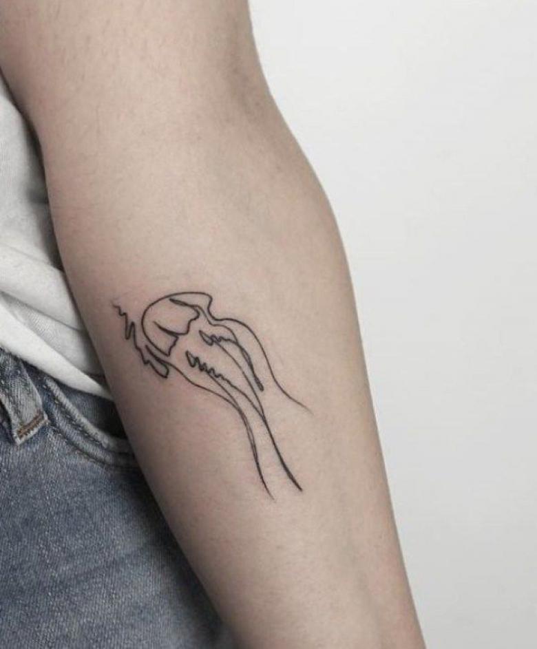Le tatouage de méduse suivant sur votre bras est fait dans le populaire style de travail au trait.Lorsque l'image est appliquée en une seule ligne, sans déchirure. Que signifie ce tatouage ? Plus probablement, il signifie flux, mouvement, tranquillité, sérénité et sagesse. Il convient aux personnes qui sont de nature calme et qui se considèrent comme assez intelligentes.