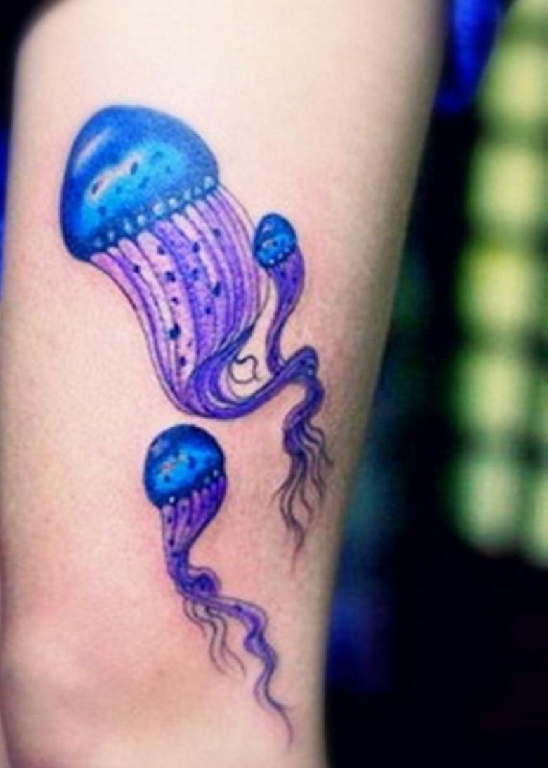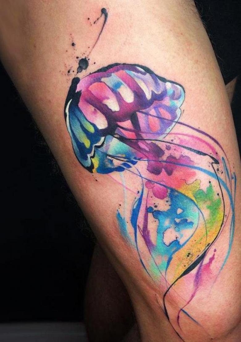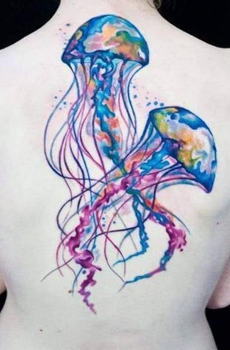 Le style aquarelle est très inhabituel et spectaculaire dans l'art du tatouage. Cette technique convient particulièrement à l'application du tatouage de la méduse, qui vit dans l'eau et s'intègre donc au style aquarelle. L'utilisation de nombreuses couleurs et nuances vives montre la confiance et la fermeté du porteur. Ce tatouage a également les significations suivantes : créativité, force, tranquillité.
