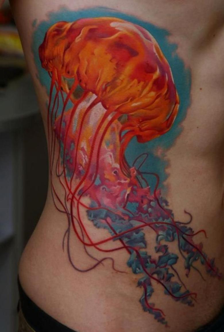 La majeure partie de ce tatouage est réalisée à l'aide d'une encre orange vif, ce qui donne au dessin un caractère audacieux et provocateur. Ce tatouage de méduse signifie l'élégance, la grâce, la fluidité, la paix, la tranquillité et la simplicité. Ainsi, une personne qui se tatoue une méduse orange doit être calme, simple, paisible, gracieuse.