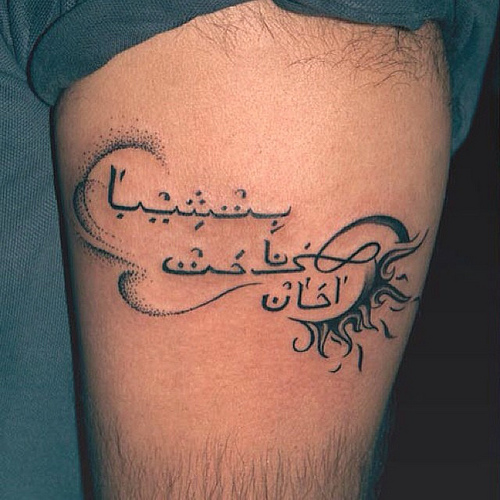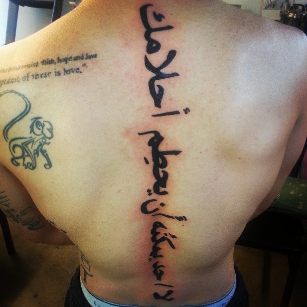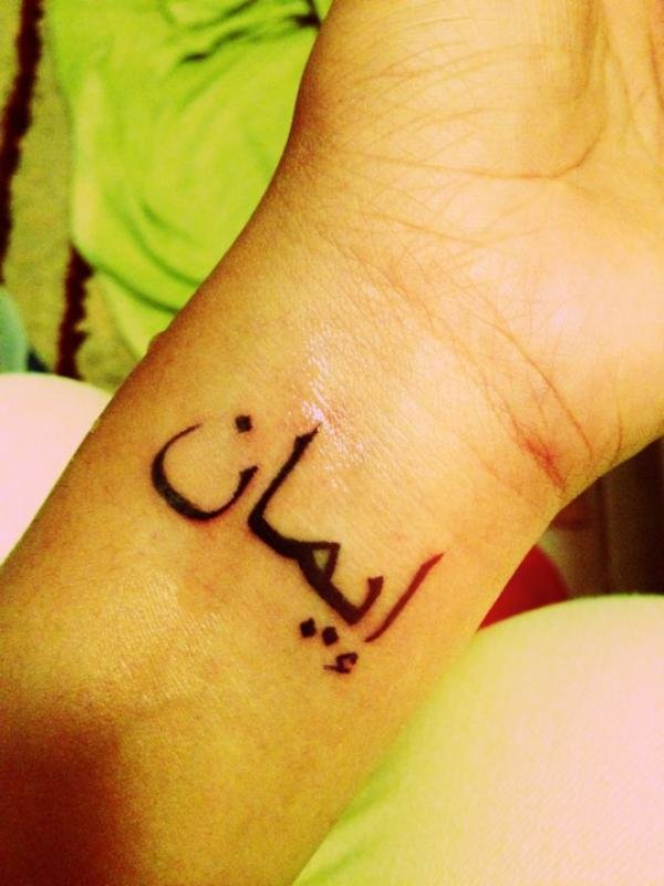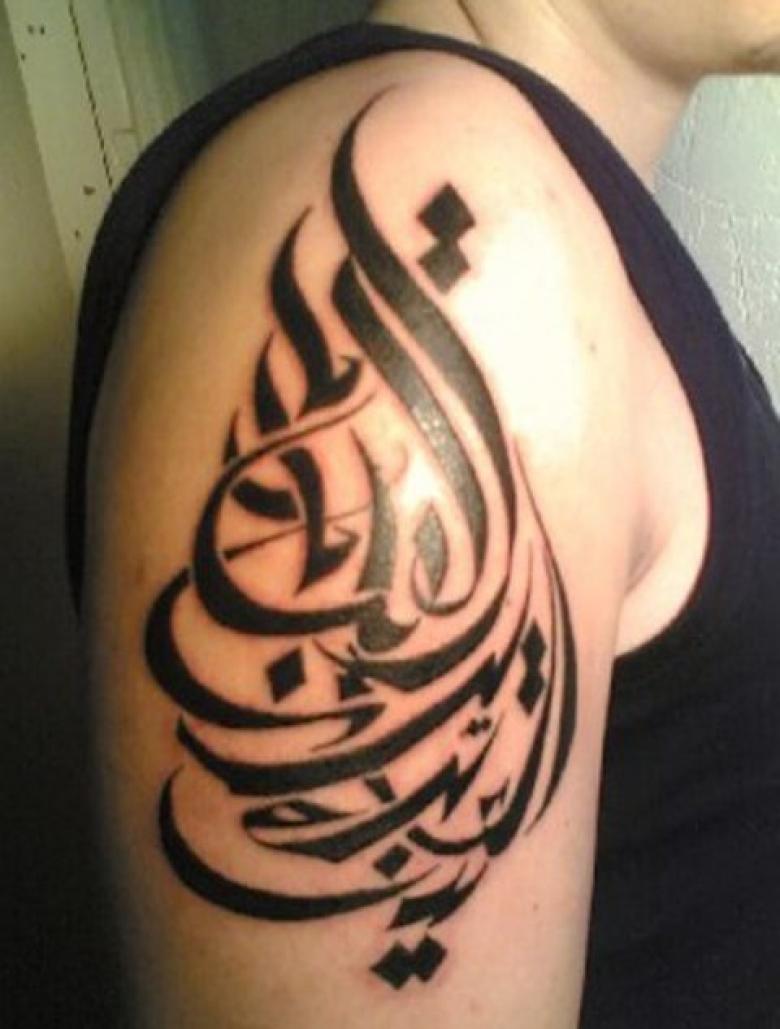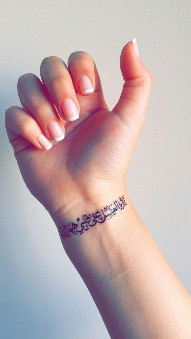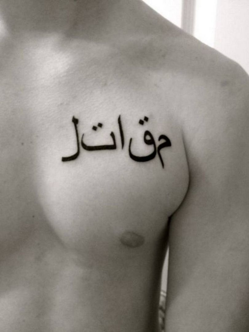 Outre les symboles arabes, vous pouvez également utiliser la calligraphie arabe pour vous tenir à l'écart de la religion. Les inscriptions arabes communes sont également très courantes à l'époque moderne, le critère le plus important pour un tel tatouage sera la traduction correcte en arabe.
