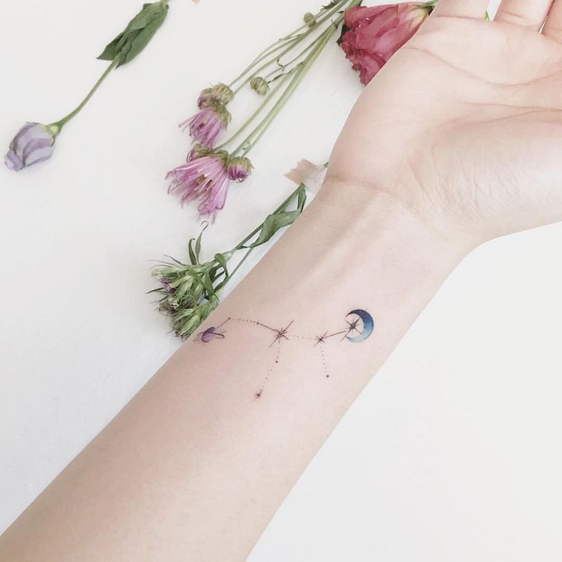 Une version classique des tatouages pour femmes. Les femmes qui croient au pouvoir des étoiles et à l'énergie du cosmos sont attirées par ces motifs. Les tatouages en forme de signe du zodiaque sont souvent représentés comme petits et soignés. On dit que le design est fait par soi-même. Ils sont appliqués au cou, à la cheville ou aux côtes.