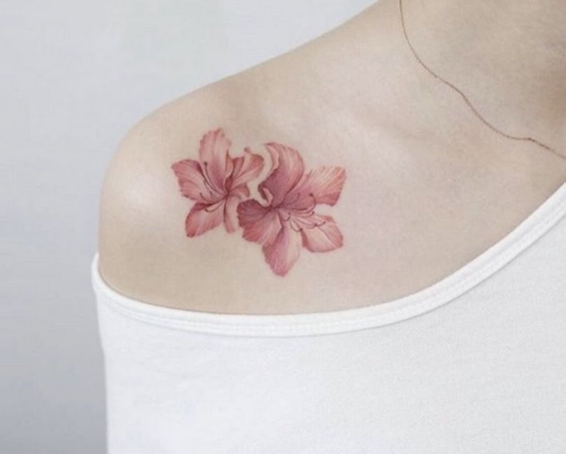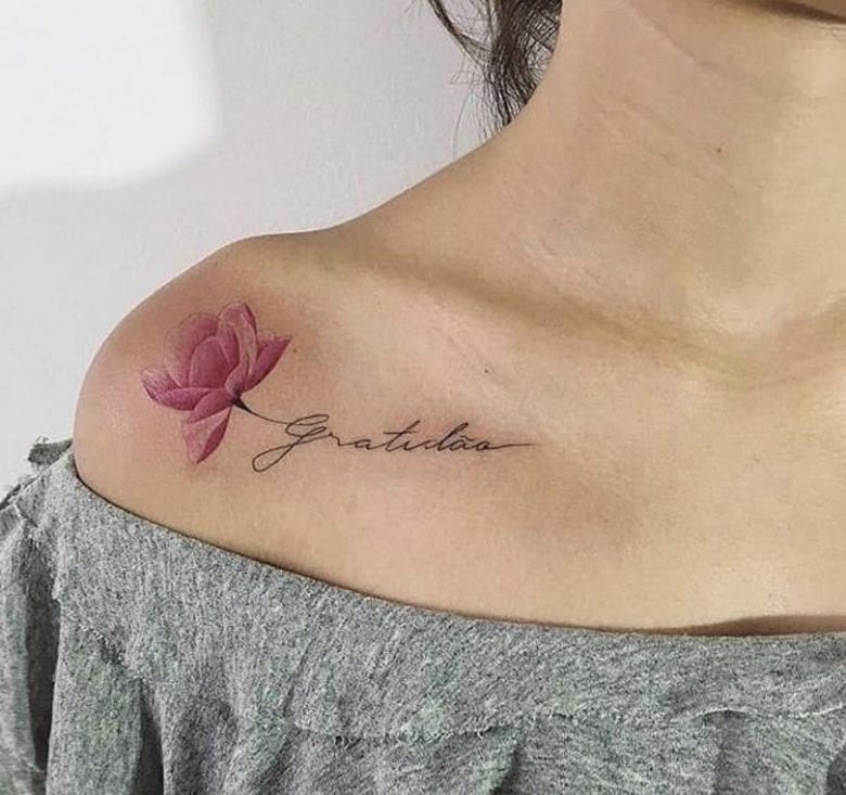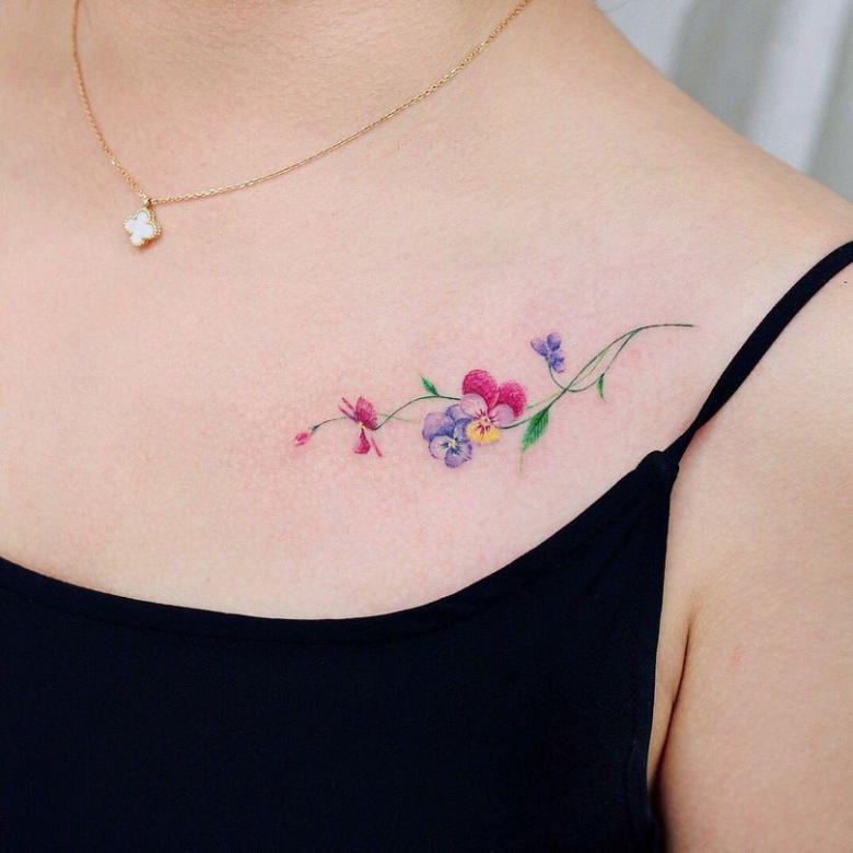 Un endroit reconnu comme l'une des parties les plus sexy du corps féminin. Le tatouage en forme de fleur est particulièrement beau. L'image peut être représentée sur une seule clavicule, ainsi que sur deux. La symétrie est également très belle. Dans ce cas, l'image peut être la même, comme s'il s'agissait d'un miroir. Ils peuvent être différents, mais avec le même thème. Par exemple, le soleil et la lune.