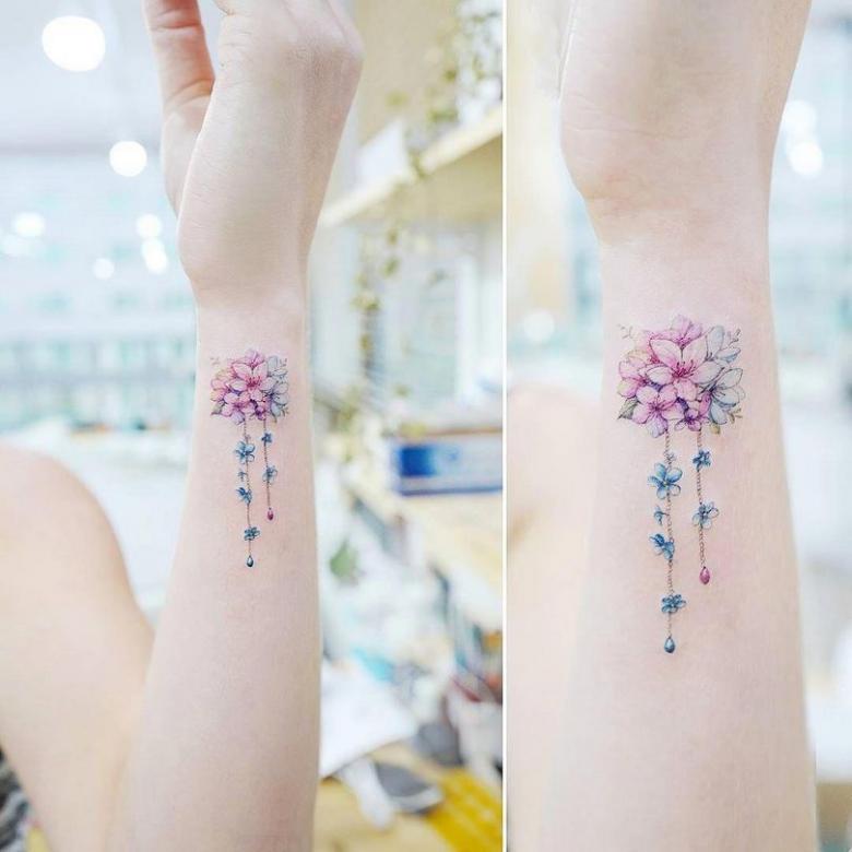 Un endroit parfait pour un tatouage de femme. Il faut tenir compte du fait que les mains sont exposées à des agressions extérieures et chimiques, de sorte que l'image s'estompe plus rapidement que sur d'autres zones. Et l'intérieur de la paume peut se détacher complètement.
