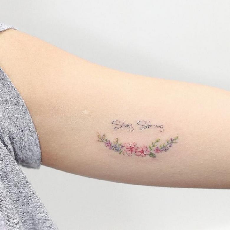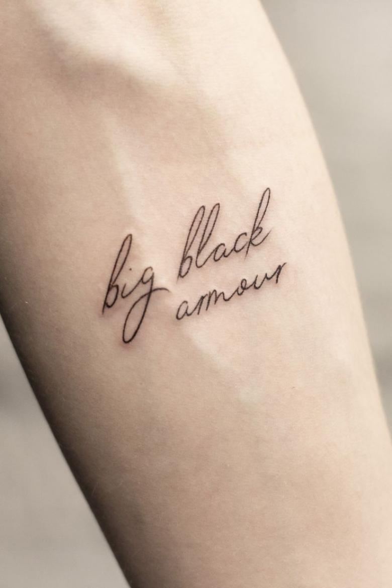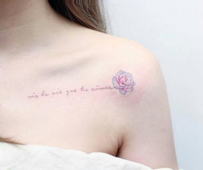 Souvent, l'image a une signification philosophique ou une fonction motivante. Une petite inscription semble douce sur la clavicule d'une femme. La bonne police de caractères joue un rôle important. La légèreté et la tendresse en dépendront. Un tatouage aux lignes fines prend une allure aérienne.