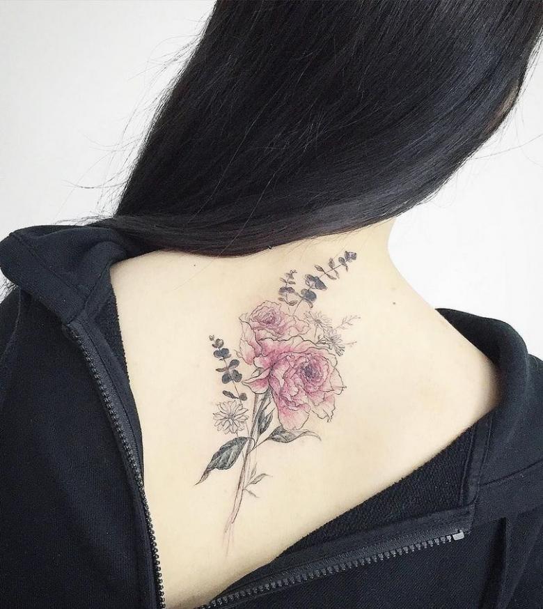 Principalement les omoplates. Les tatouages sont également inscrits au milieu des omoplates, plus près du cou. Le dessin accentue les courbes soignées du dos d'une femme.