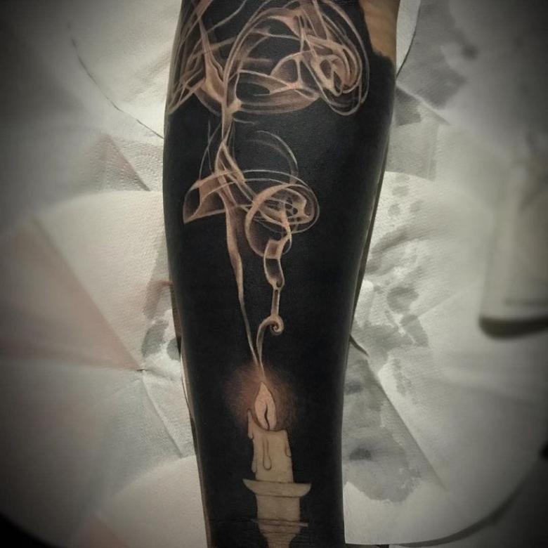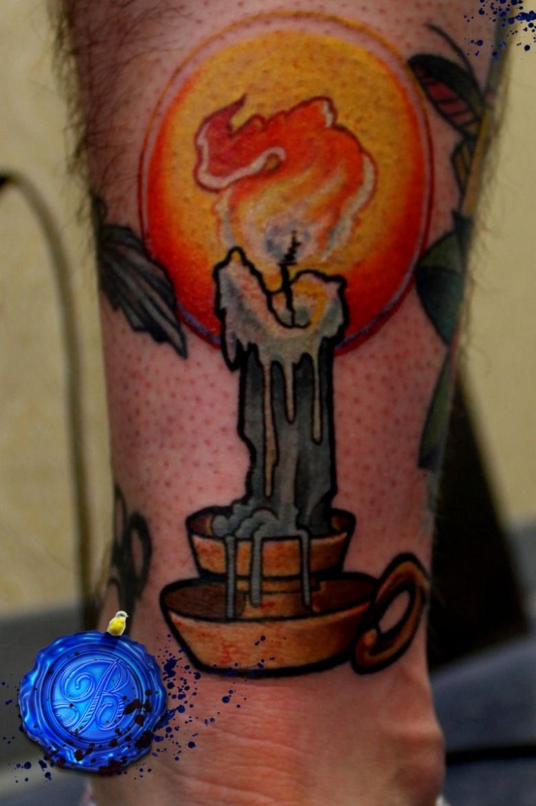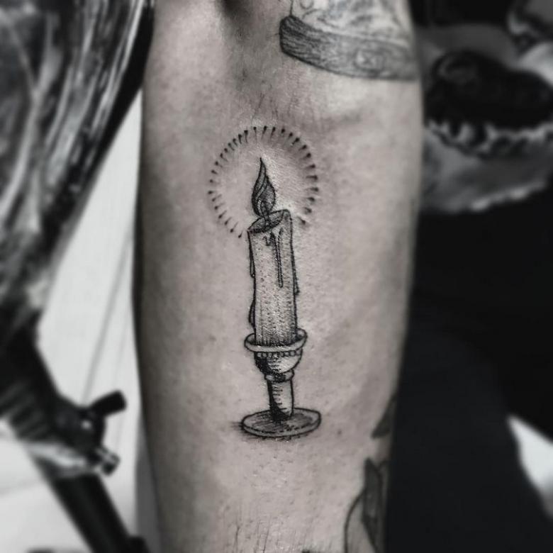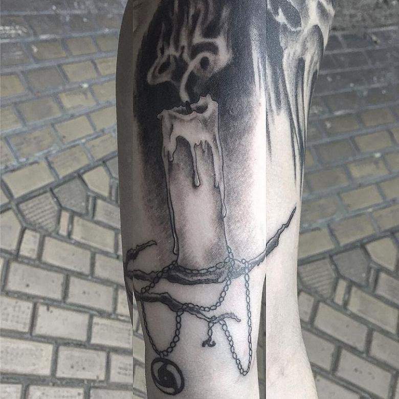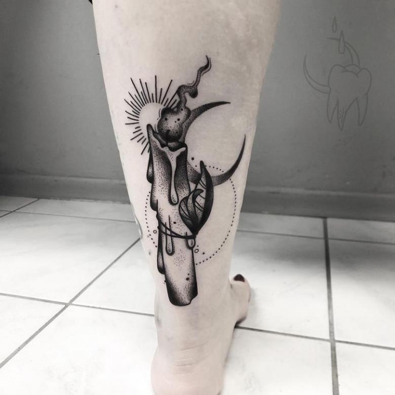 - De Slavische mythologie interpreteert het beeld van een brandende kaars in de tatoeage als een heilig vuur, een krachtig en wonderbaarlijk element. Een brandende kaars is een symbool van zuivering van kwade krachten, bescherming tegen magische invloed op het lot, eerbied voor de machtige krachten van de natuur en erkenning van de onvolmaaktheid van de menselijke natuur;