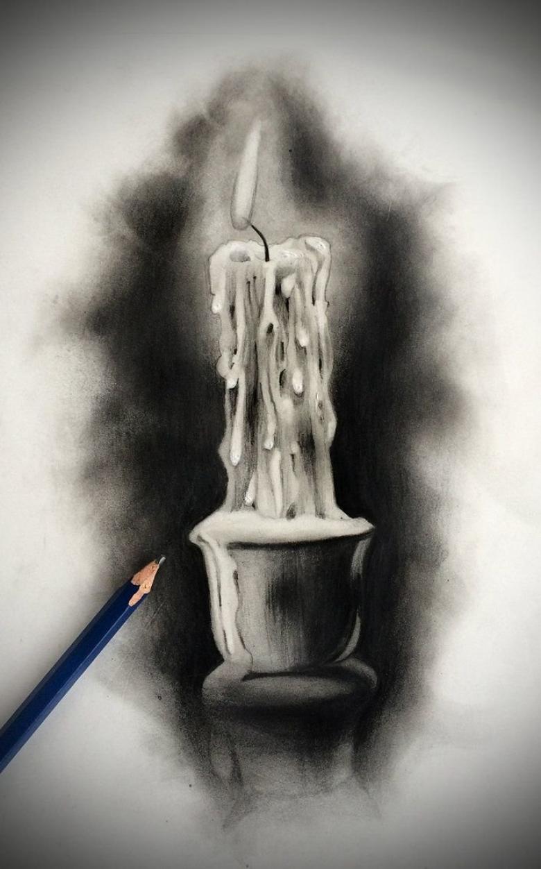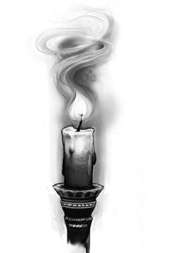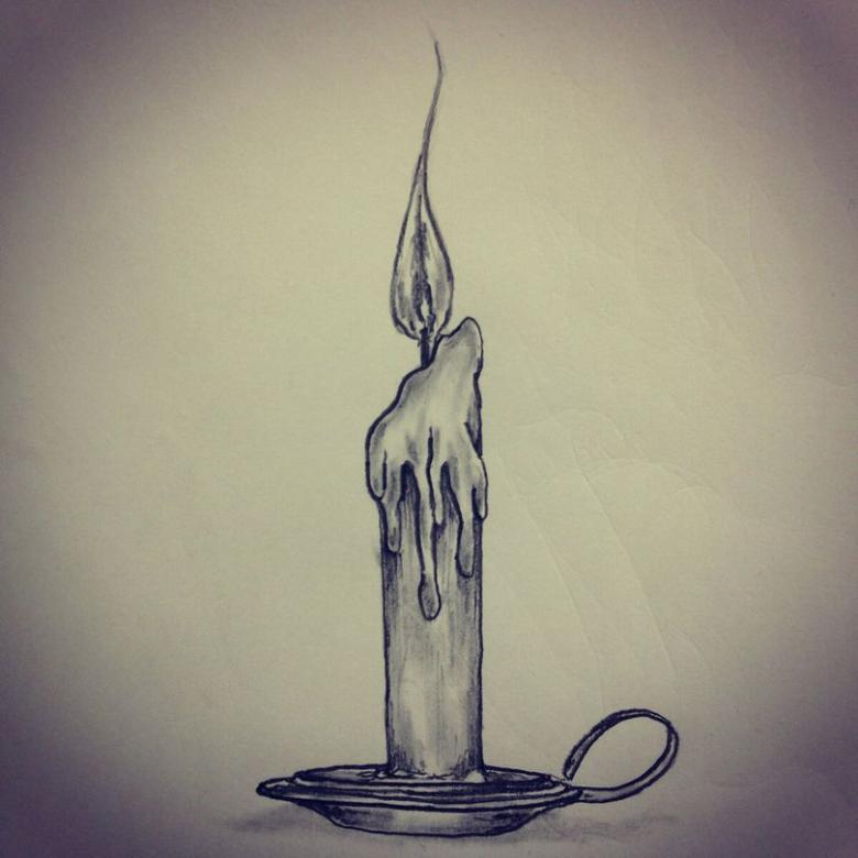 In de schets kan de kaars fel branden of smeulen, de vlam kan duidelijk zijn of vervagen door een windvlaag of regendruppels.