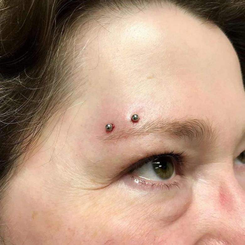 - Perçage diagonal. La procédure est similaire à la variation horizontale, la seule différence étant l'angle du piercing, qui est effectué sur toute la largeur du front. Elle a un aspect original, guérit assez rapidement et il y a peu de risques de complications.