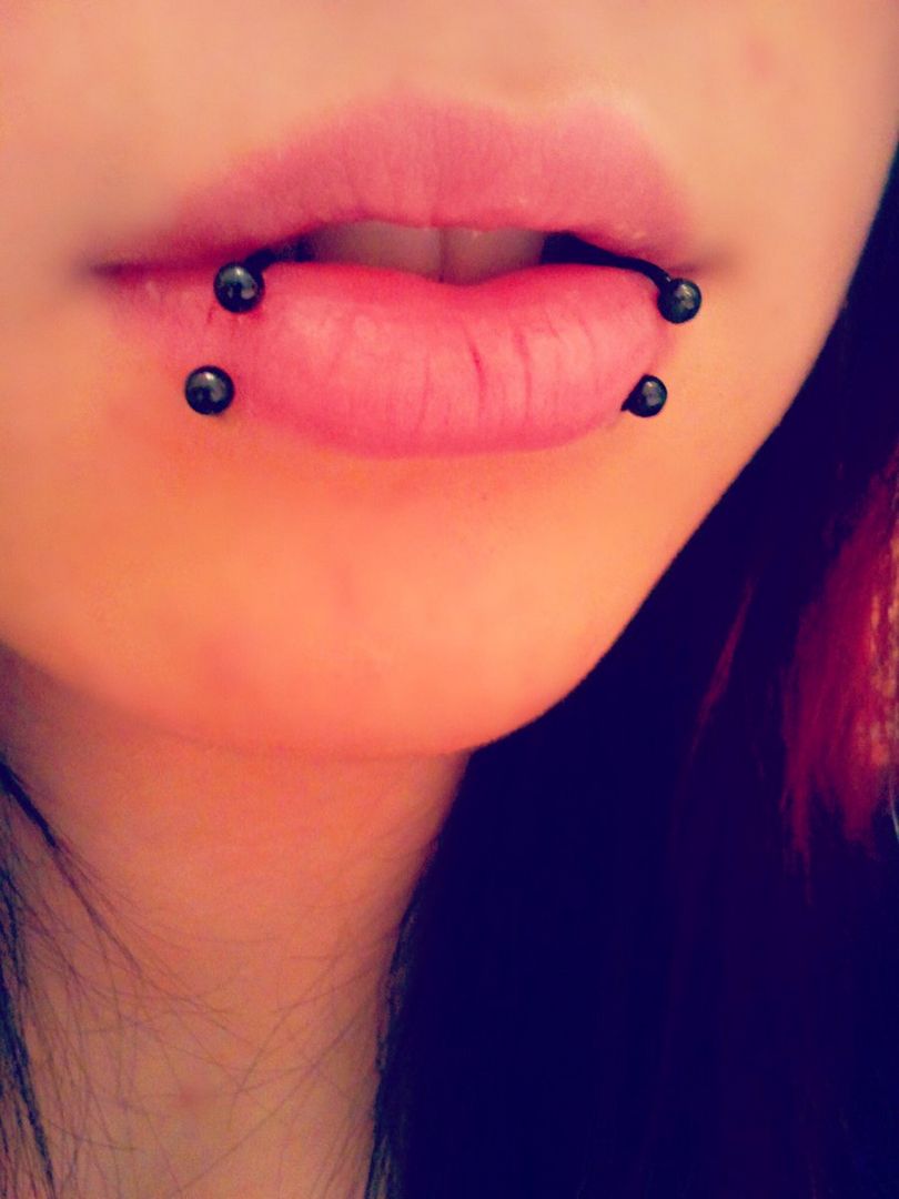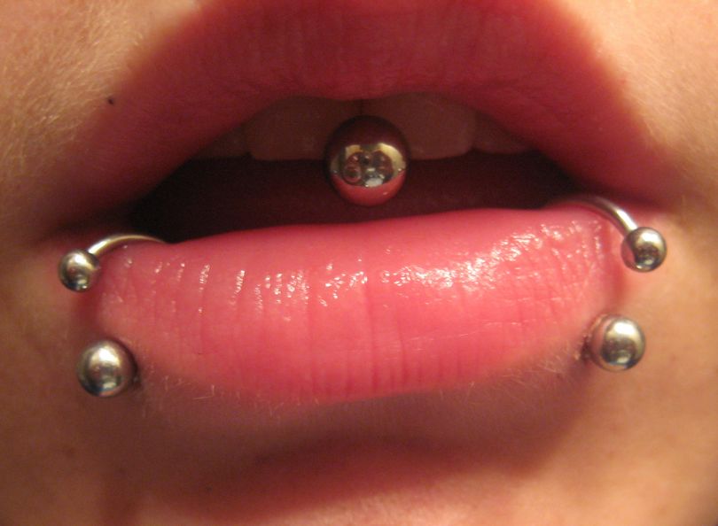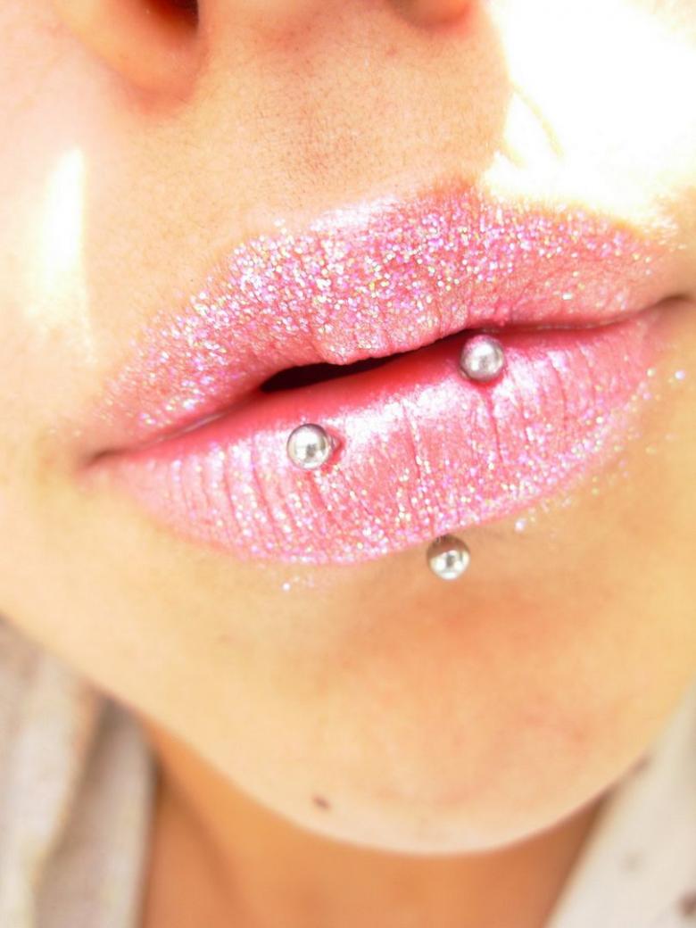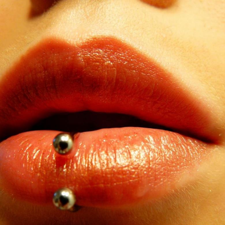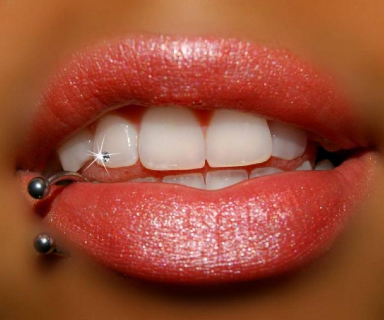 - Morsure de dahlia. Deux petites décorations sont placées dans les coins de la bouche. Un des plus spectaculaires piercings à la lèvre.