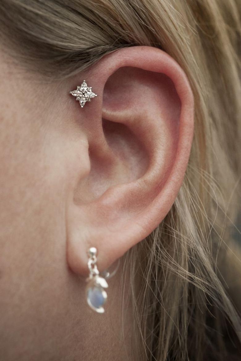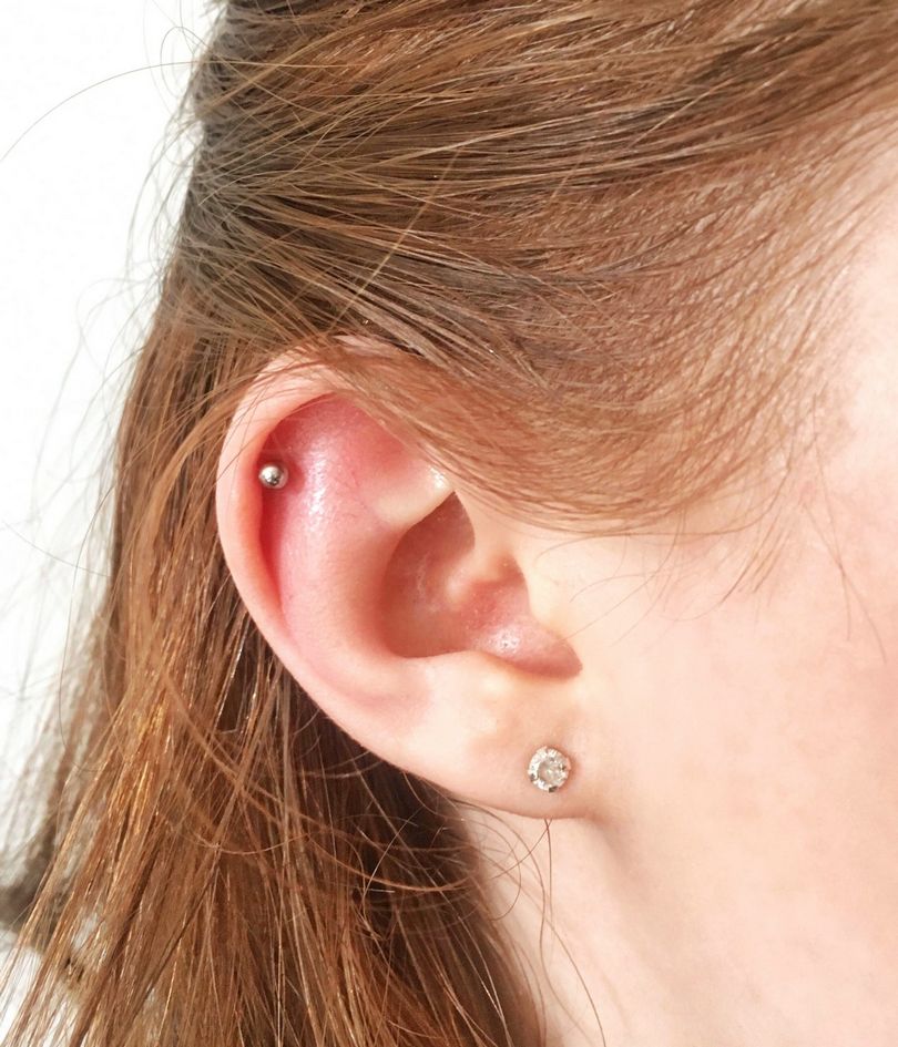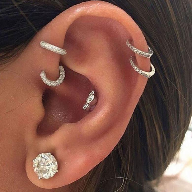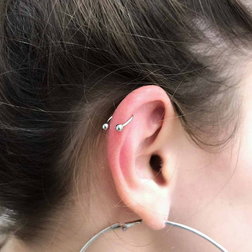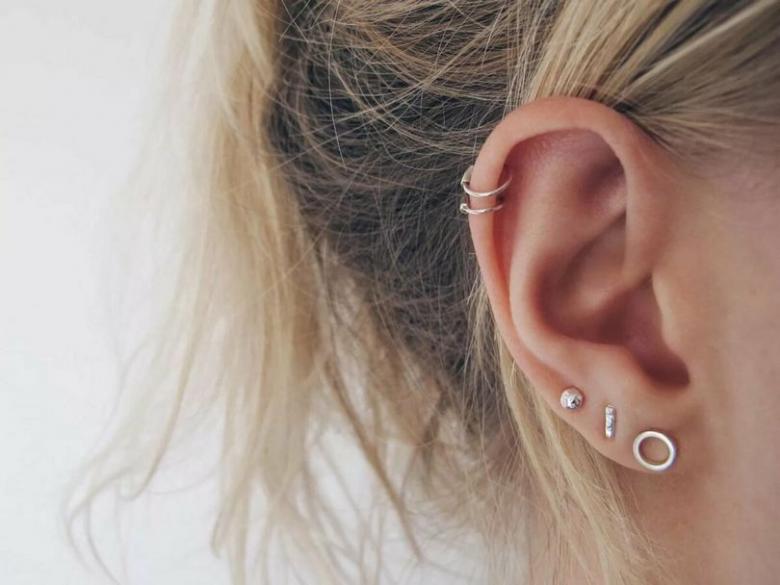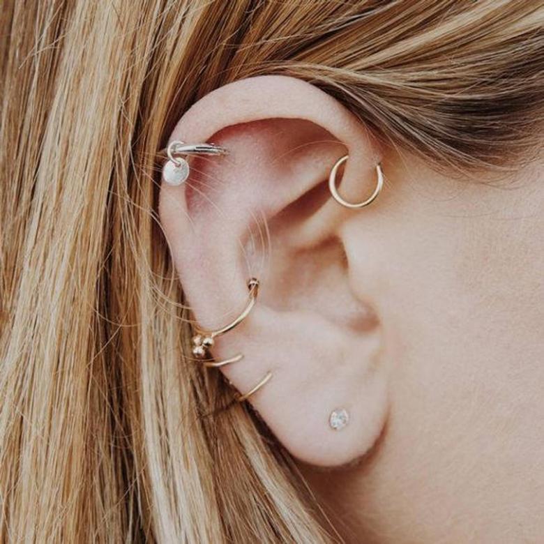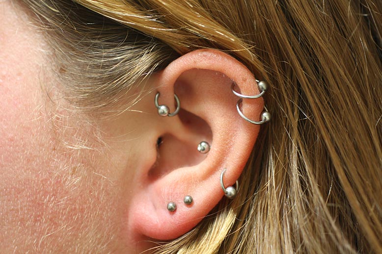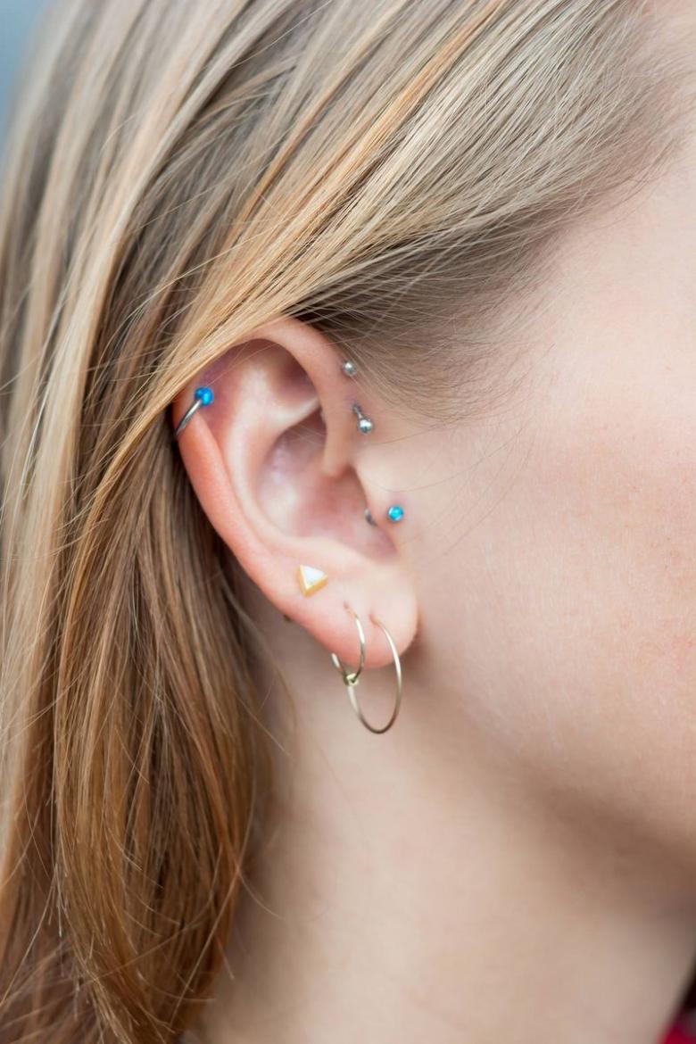 Piercing Helix - technique, procédure douloureuse, comment choisir bagues, boucles d'oreilles et autres bijoux, superbes photos