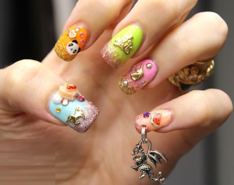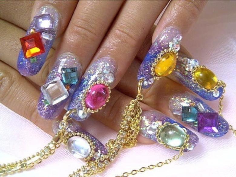 Pour éviter de s'accrocher aux bijoux, les décorations doivent être de petite taille et dépourvues d'angles vifs. Pour éviter d'endommager l'ongle, les extrémités des ongles artificiels sont soigneusement percées et toute la procédure est effectuée par la prothésiste ongulaire.