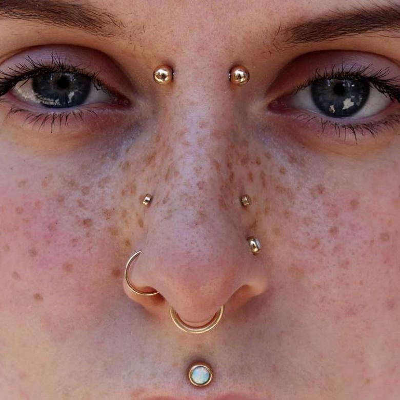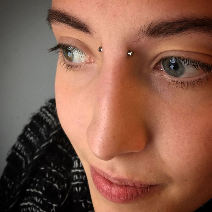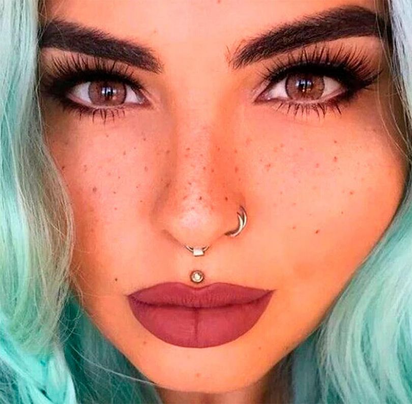 Austin Bar. Ce type est le plus douloureux et le plus problématique. Ici, les boucles d'oreilles sont placées symétriquement sur le bout du nez (ou une seule boucle d'oreille traversant le bout du nez de bas en haut). Les maîtres des studios le considèrent comme l'un des types de piercings les plus complexes, c'est pourquoi son prix est le plus élevé.