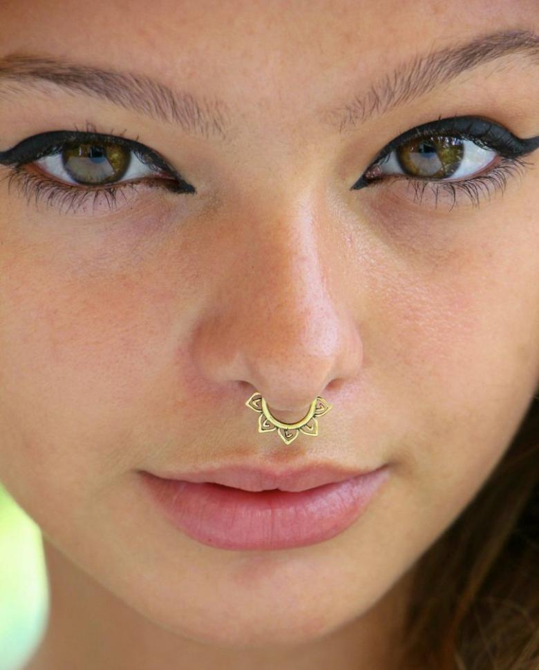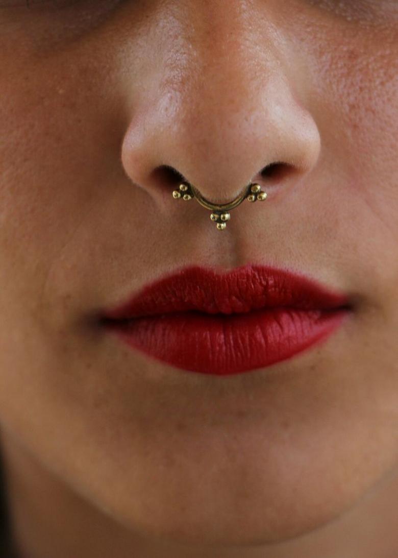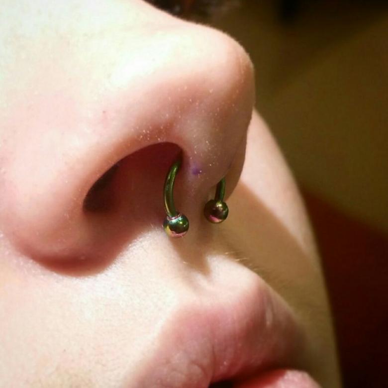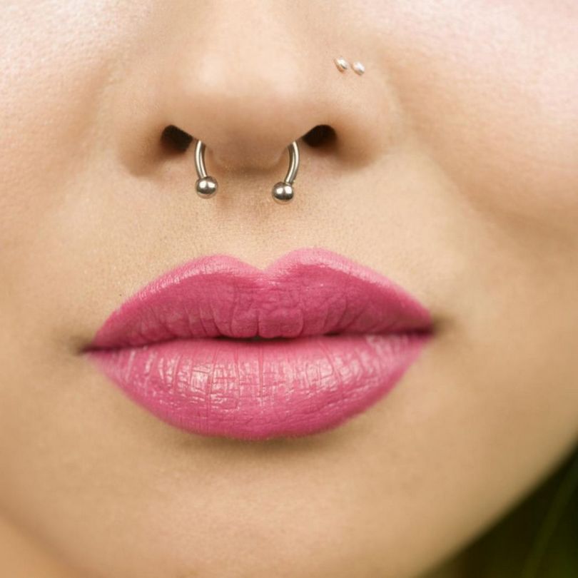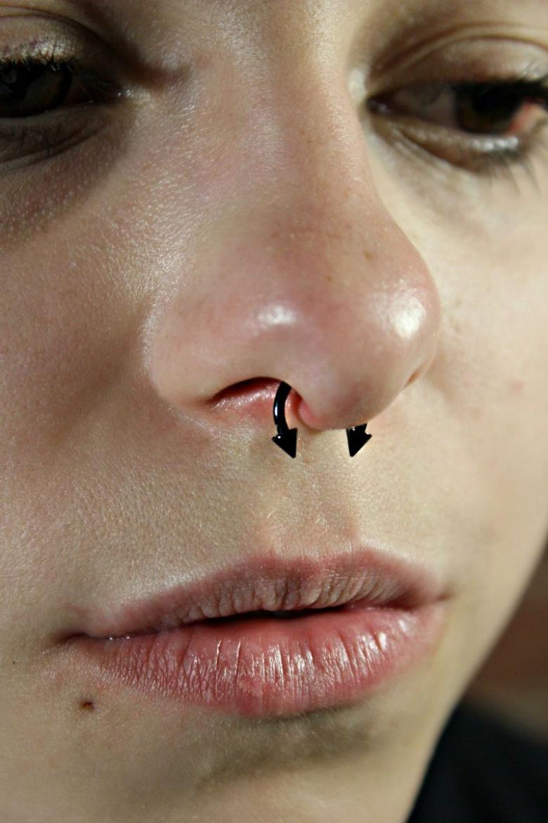 Septum ou piercing du septum. Au début des années 10, il était au sommet de sa popularité, il partage donc activement la primauté avec le perçage de l'aile. La guérison complète prend jusqu'à 8 mois. La partie du nez qui relie les narines, appelée columelle, est percée. Il est important de choisir un artisan compétent qui percera la peau et non le cartilage, sinon le temps de guérison sera plus long.