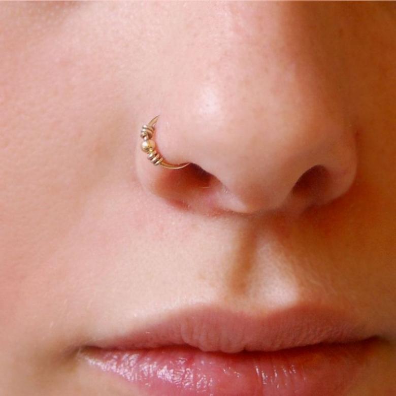 - Un œillet est la décoration de nez la plus inappropriée, bien qu'il soit parfois utilisé. Ils diffèrent de l'œillet porté aux oreilles par le fait que la boule d'épaississement à l'extrémité n'est pas dévissée. Ce bijou est coulé en une seule pièce et est inséré avec la bille à travers la perforation, ce qui est très difficile, douloureux et peut entraîner un traumatisme et une répétition du processus de guérison.