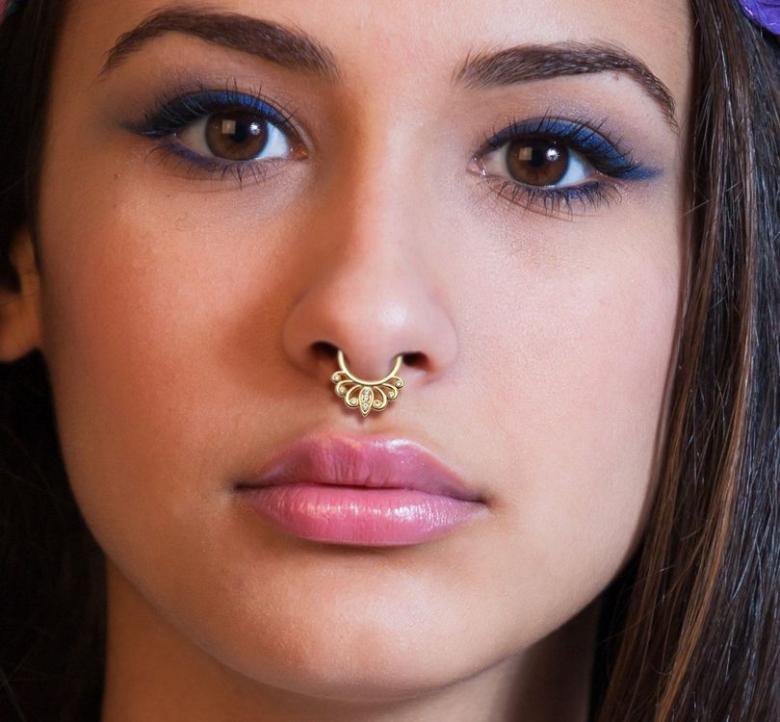 - Anneau. De préférence avec une boule, car elle fixe la boucle d'oreille et l'empêche de sortir inopinément. Non recommandé pour les bijoux primaires. Il existe différentes variantes de demi-anneaux, ou bananes de piercing du septum. Ils sont spectaculaires et concis.
