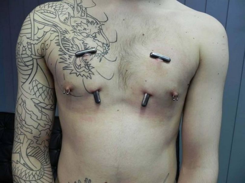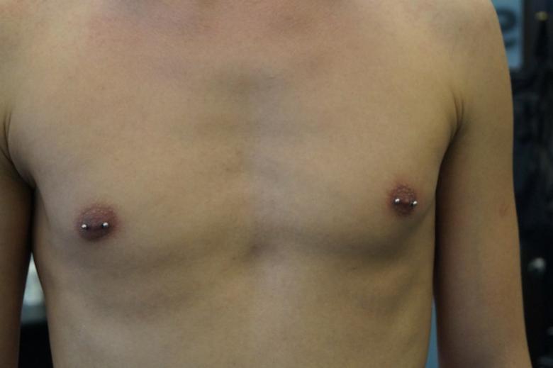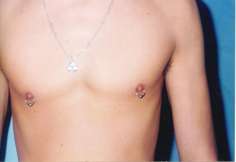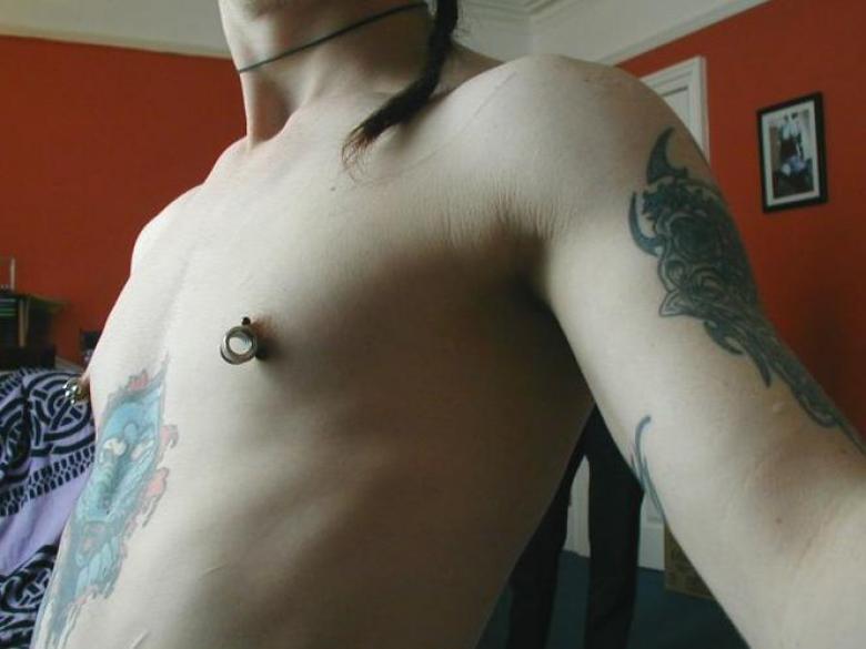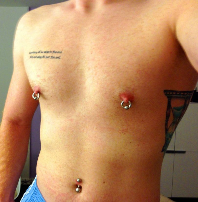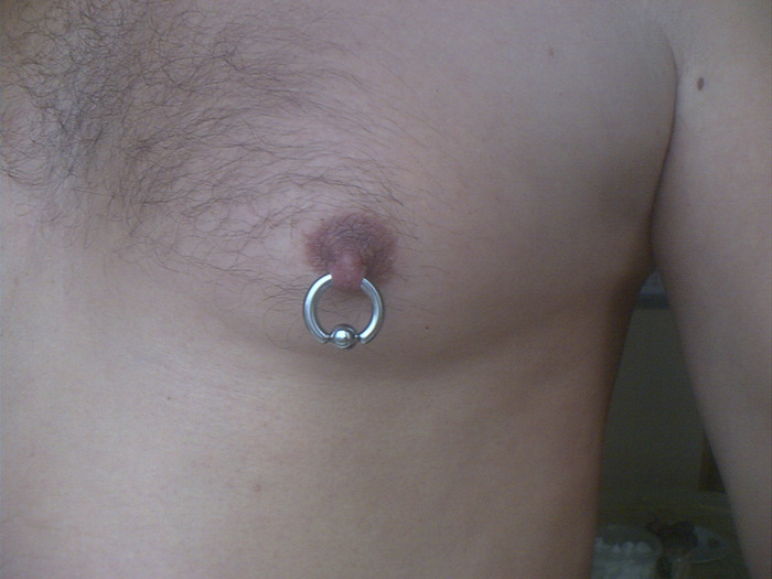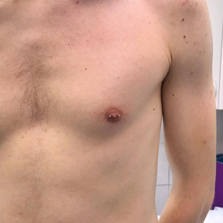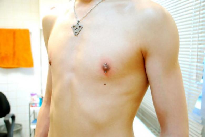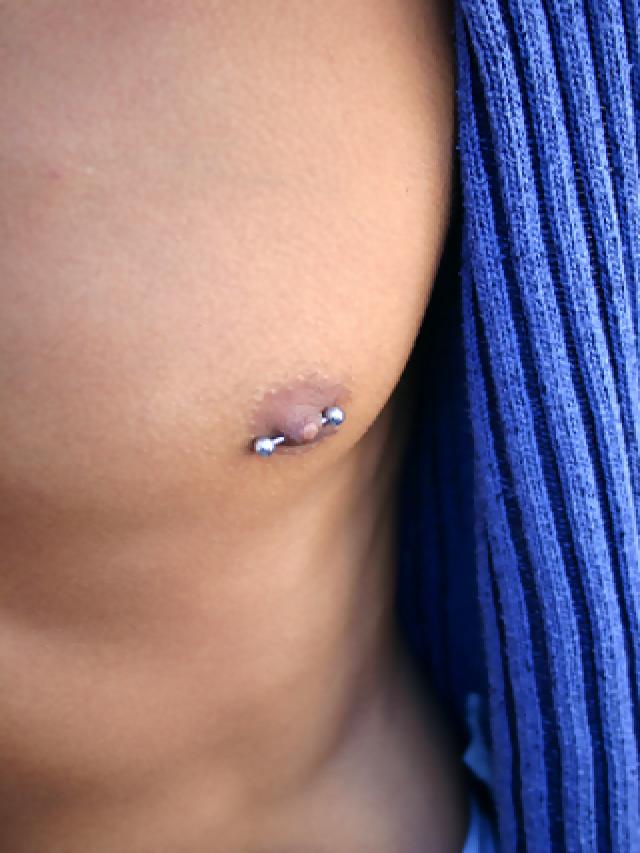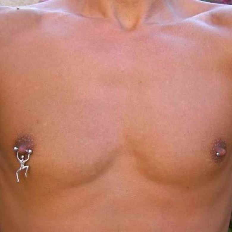 - Piercing dans la zone située derrière le mamelon. Dans ce cas, le piercing est réalisé dans la zone pigmentée située derrière le mamelon. Ce type de piercing est populaire chez les hommes, car tous les hommes n'ont pas des mamelons suffisamment grands pour être percés.