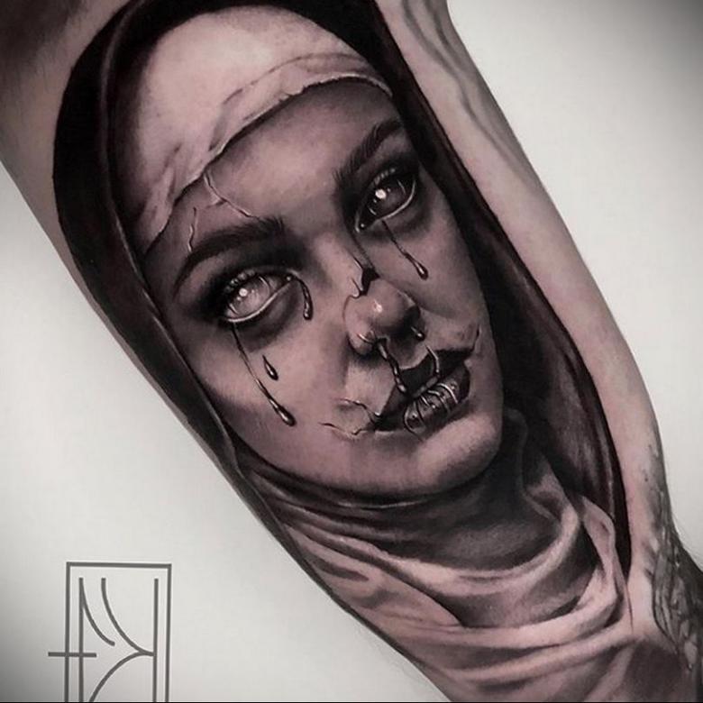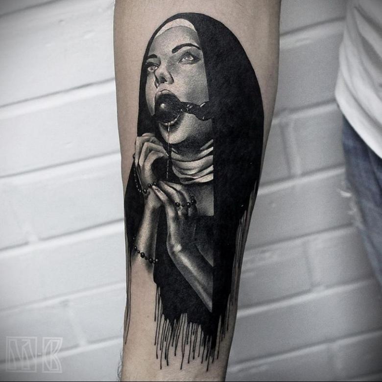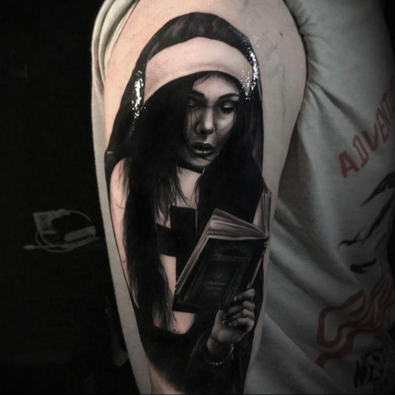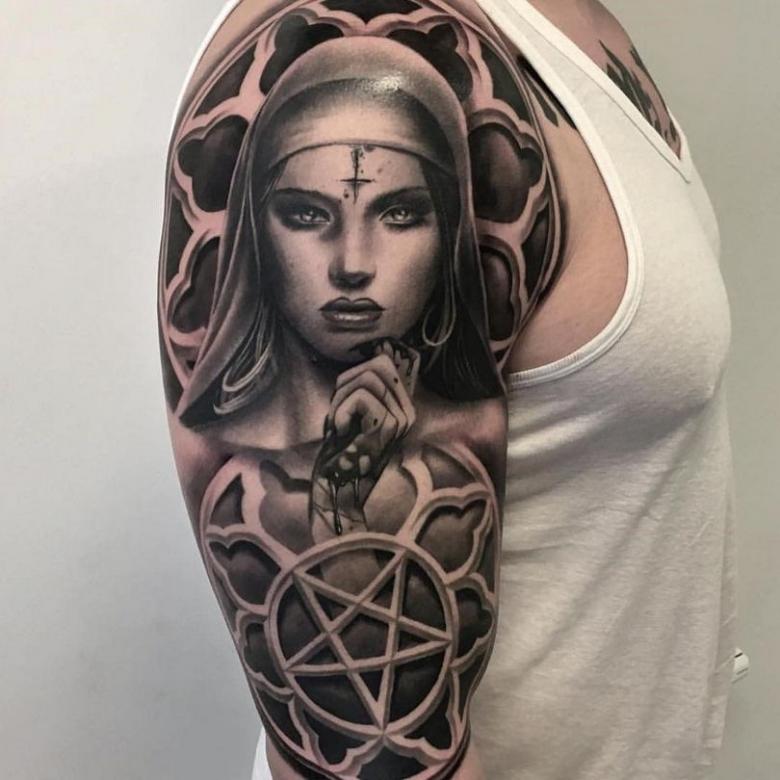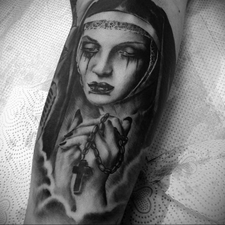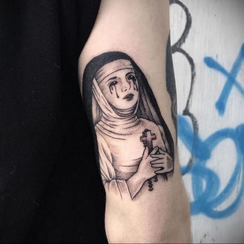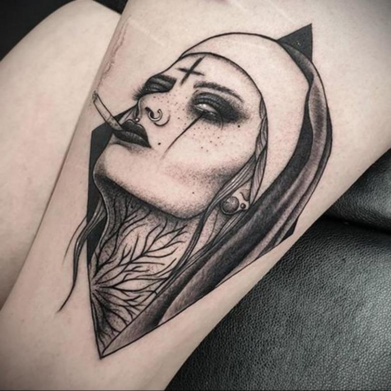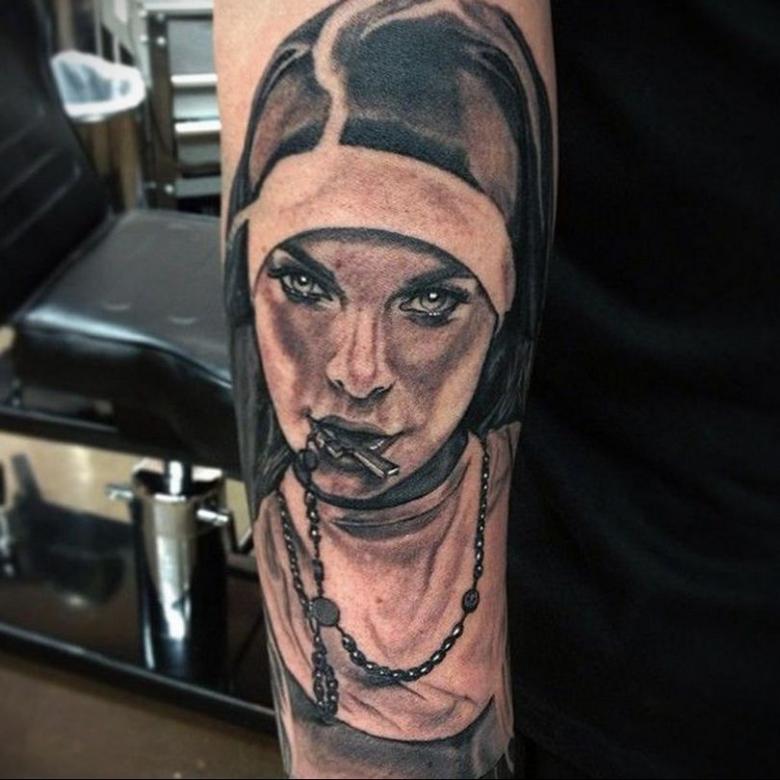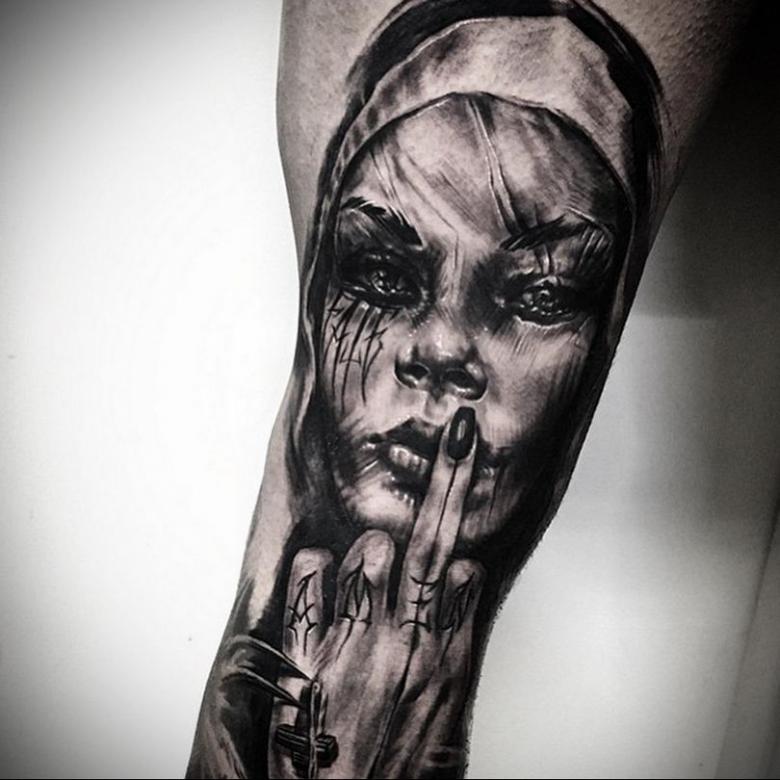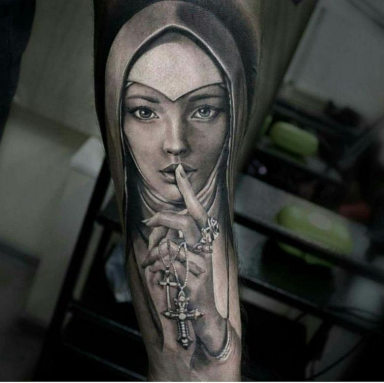Piękna kobieca twarz w zakonnym płaszczu, z krzyżem i różańcem, w pozie modlitewnej lub z zasłoniętymi oczami, spoglądająca na nas czule z cudzego ciała. Ten szkic na pewno pozostanie w pamięci, ponieważ tatuaż zakonnicy nie jest spotykany zbyt często, ale zawsze jest wykonywany tak zgrabnie i szczegółowo, jak to tylko możliwe. A głęboka wymowa portretu, oprócz przyjemności estetycznej, skłania do refleksji filozoficznej.