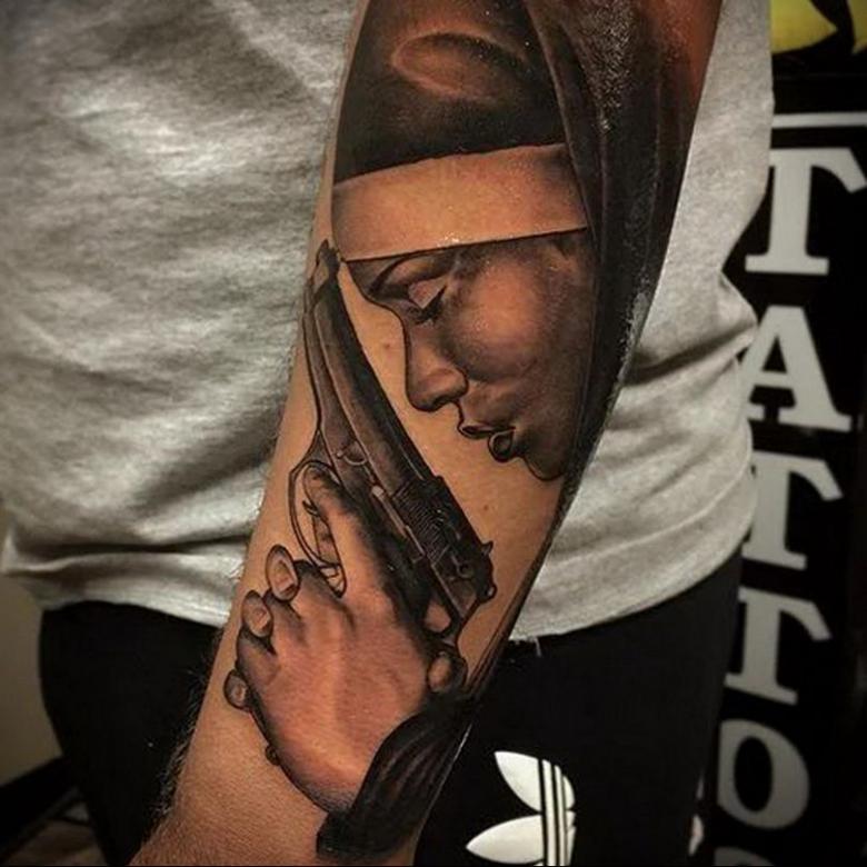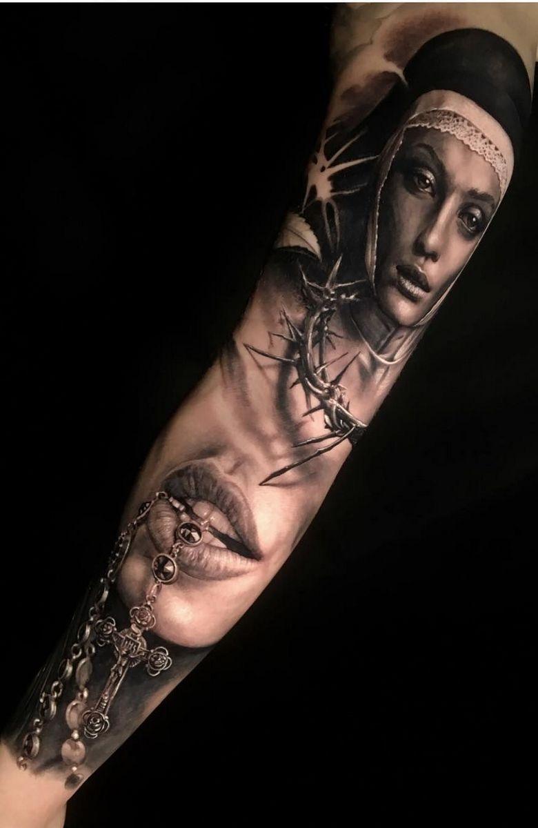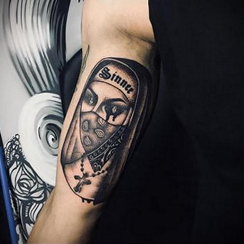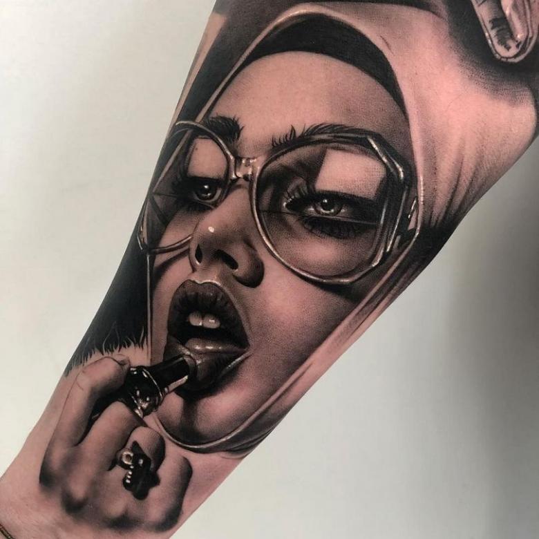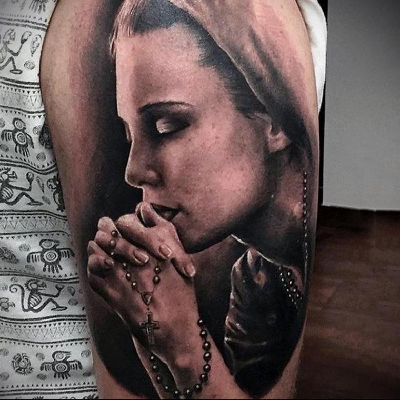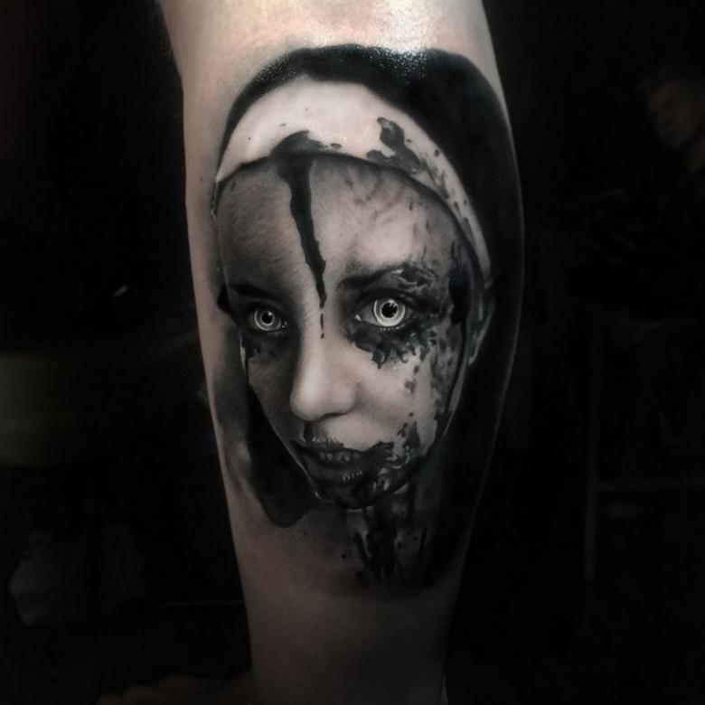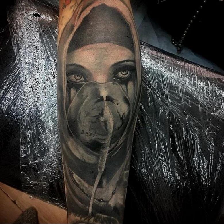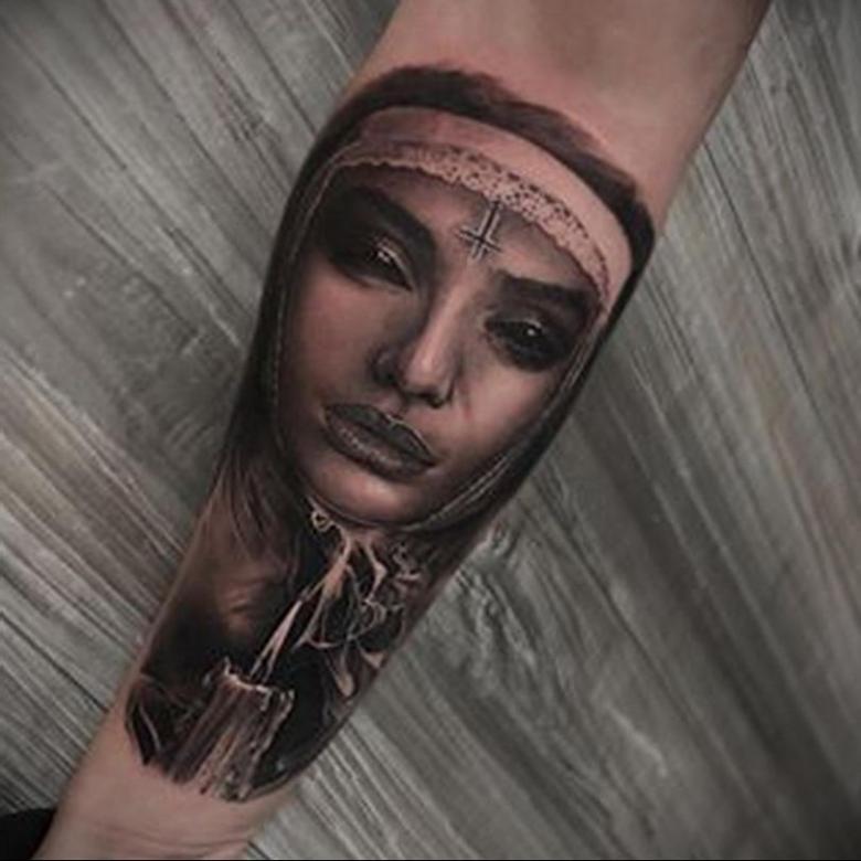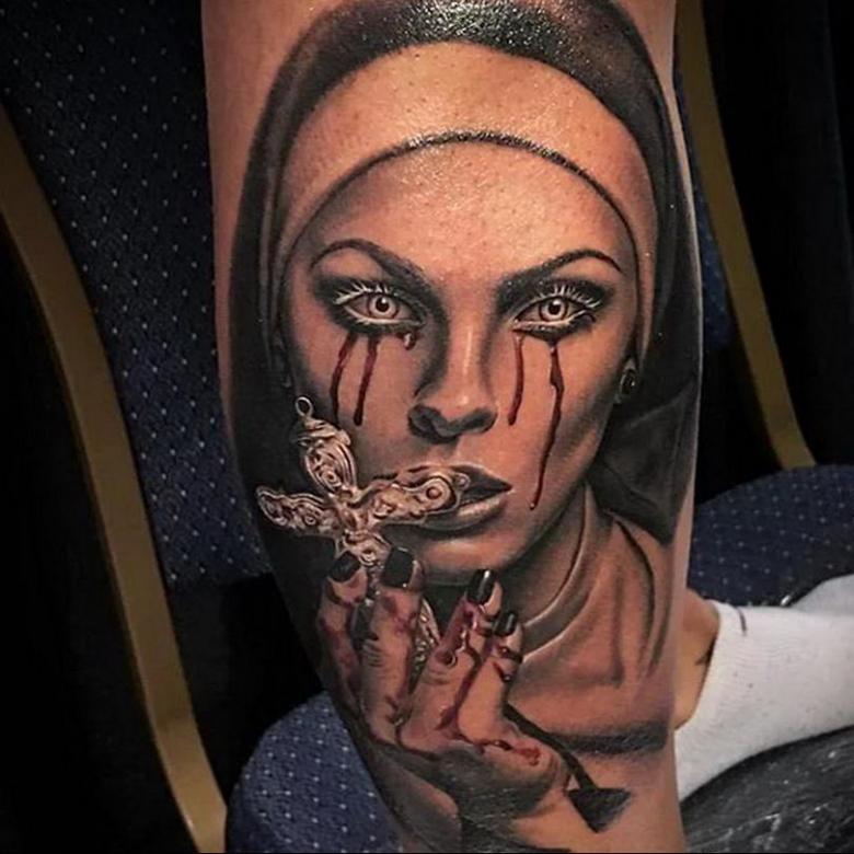 Piękna kobieca twarz w zakonnym płaszczu, z krzyżem i różańcem, w pozie modlitewnej lub z zasłoniętymi oczami, spoglądająca na nas czule z cudzego ciała. Ten szkic na pewno pozostanie w pamięci, ponieważ tatuaż zakonnicy nie jest spotykany zbyt często, ale zawsze jest wykonywany tak zgrabnie i szczegółowo, jak to tylko możliwe. A głęboka wymowa portretu, oprócz przyjemności estetycznej, skłania do refleksji filozoficznej.
