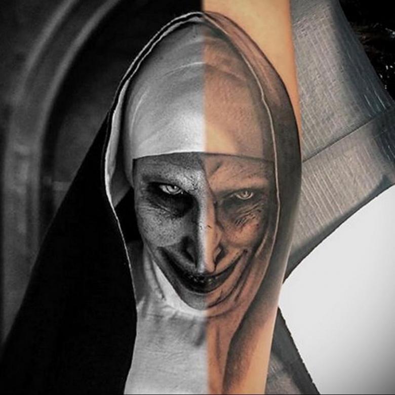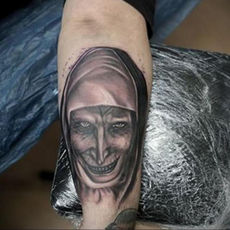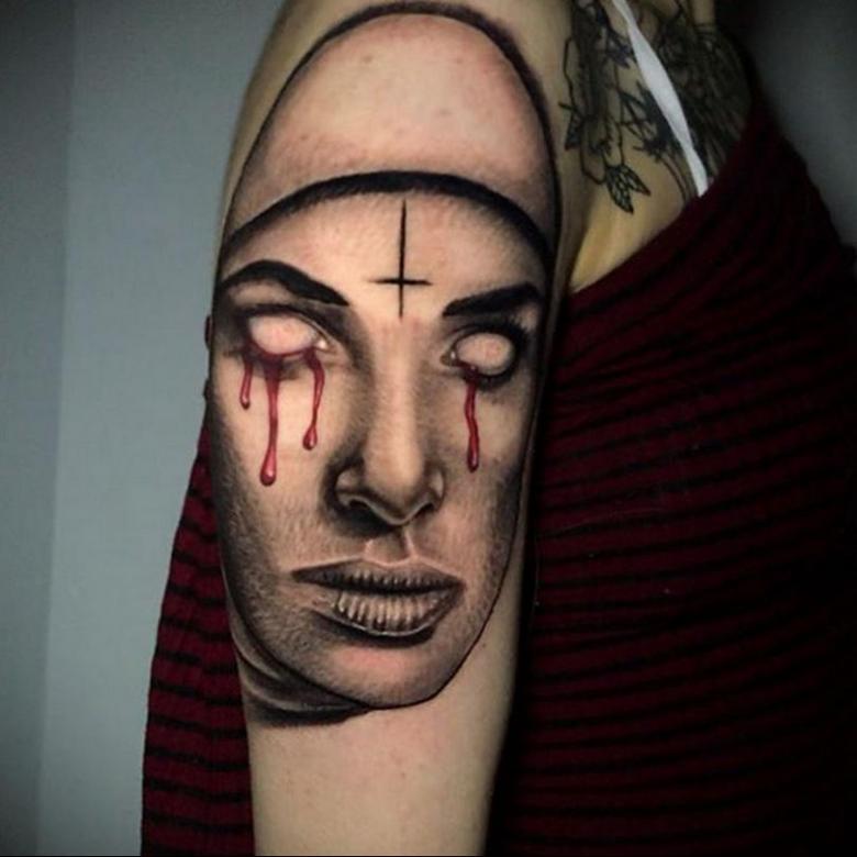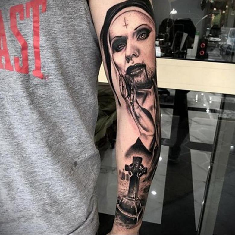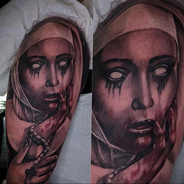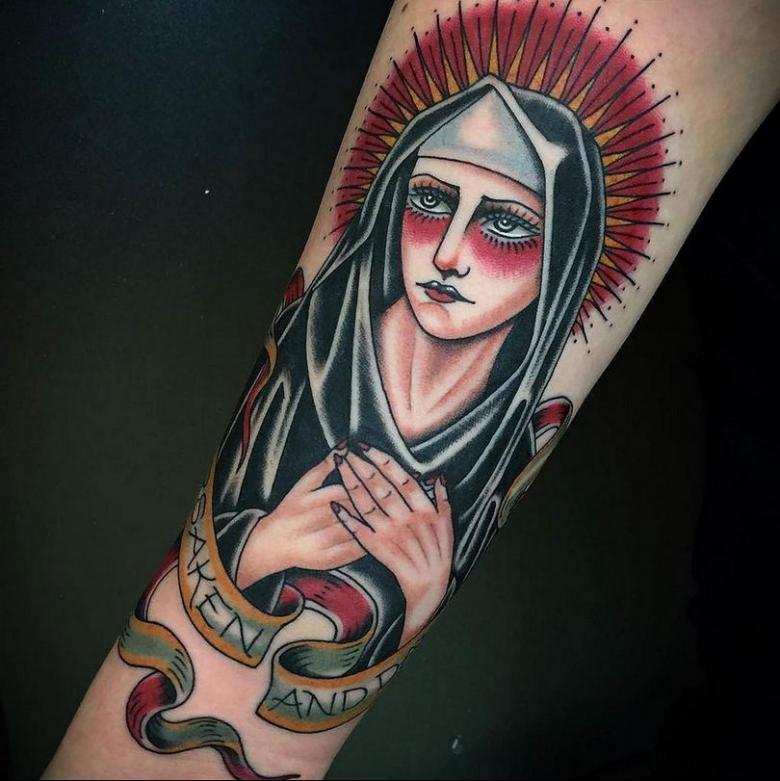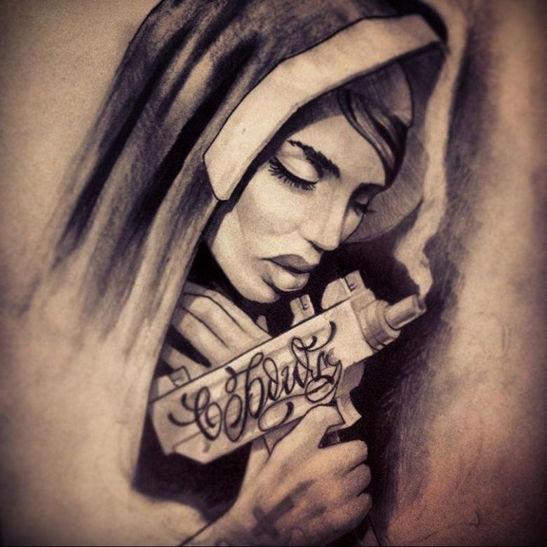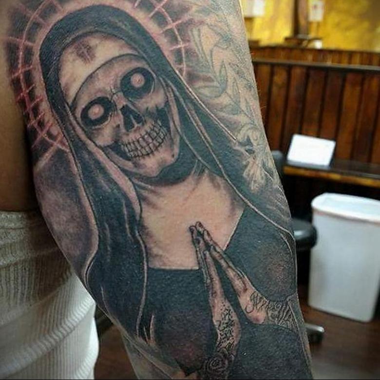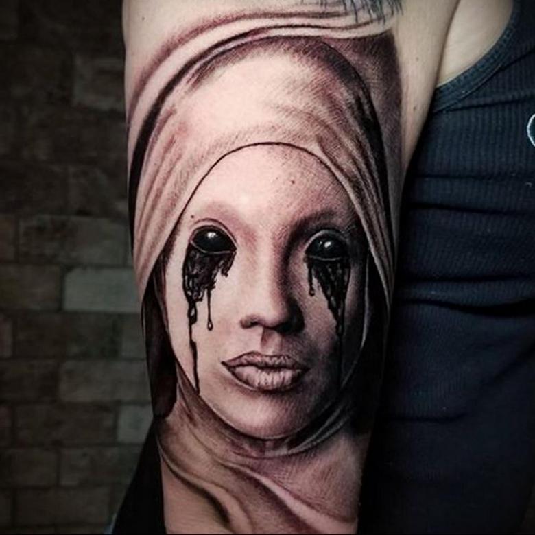 Piękna kobieca twarz w zakonnym płaszczu, z krzyżem i różańcem, w pozie modlitewnej lub z zasłoniętymi oczami, spoglądająca na nas czule z cudzego ciała. Ten szkic na pewno pozostanie w pamięci, ponieważ tatuaż zakonnicy nie jest spotykany zbyt często, ale zawsze jest wykonywany tak zgrabnie i szczegółowo, jak to tylko możliwe. A głęboka wymowa portretu, oprócz przyjemności estetycznej, skłania do refleksji filozoficznej.