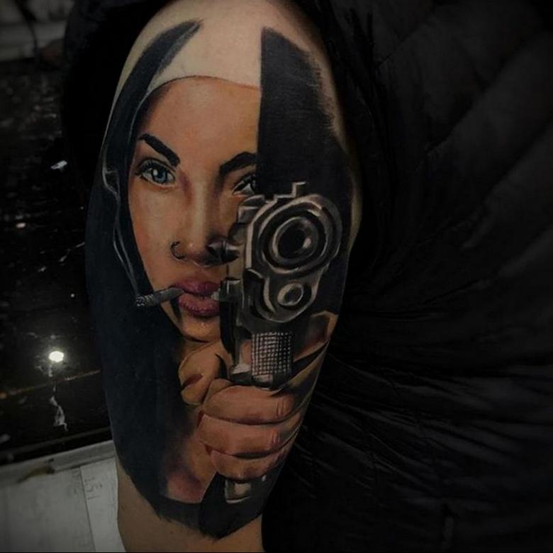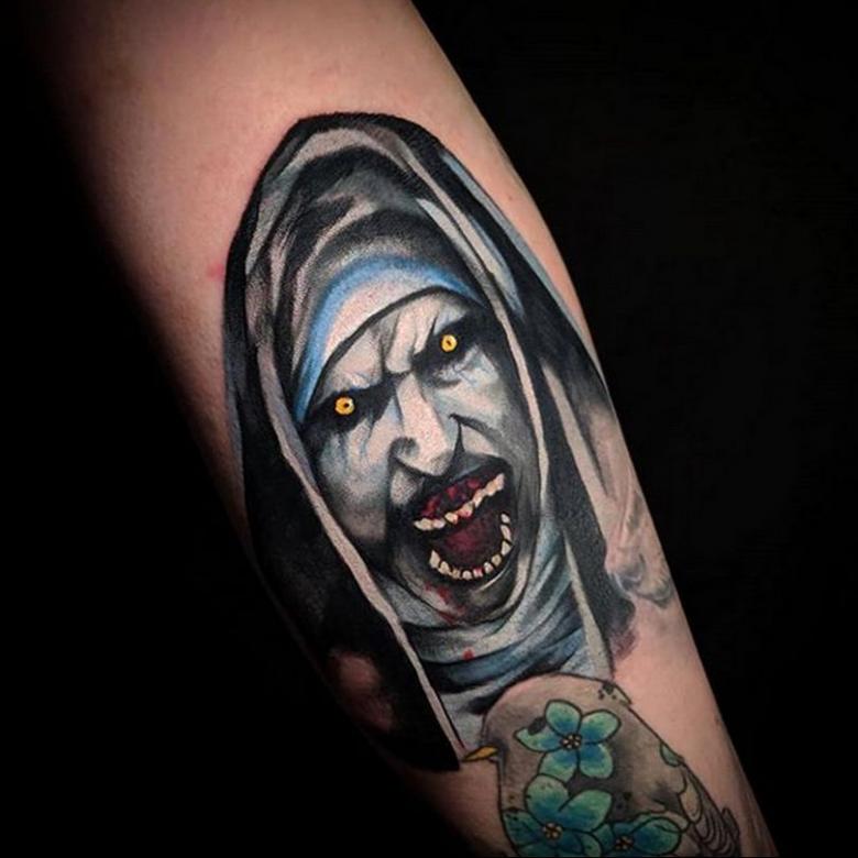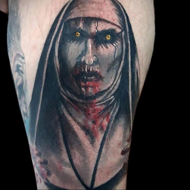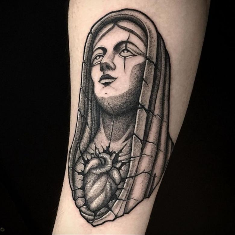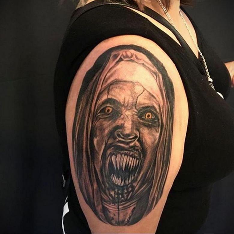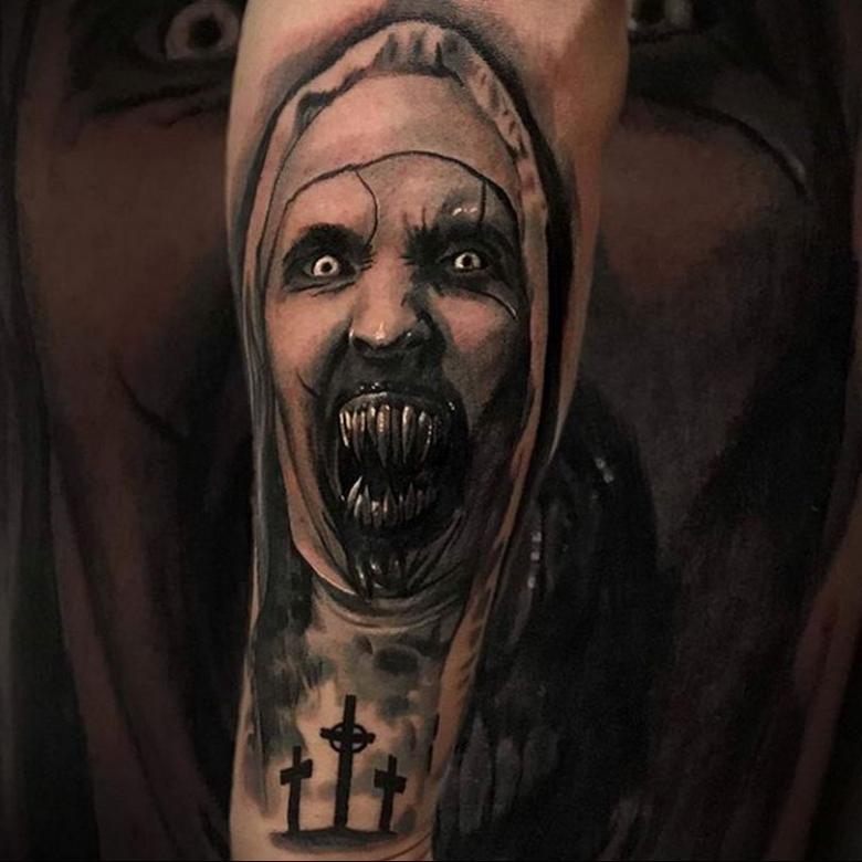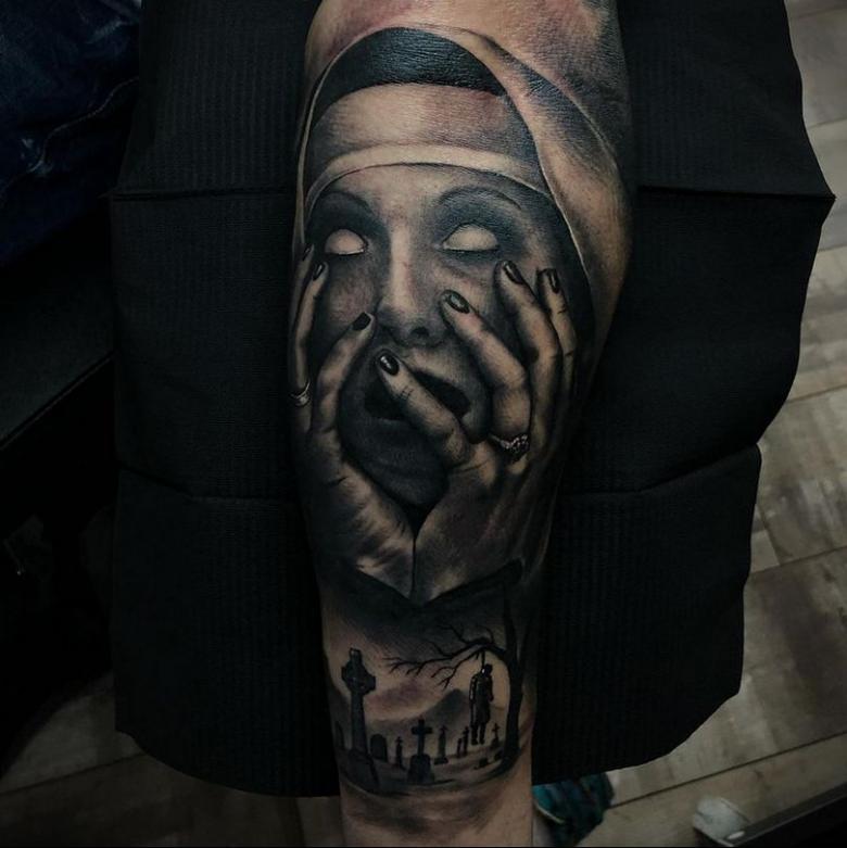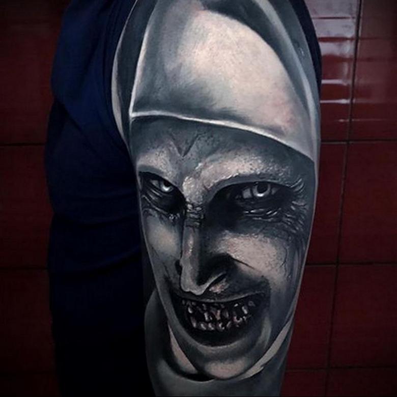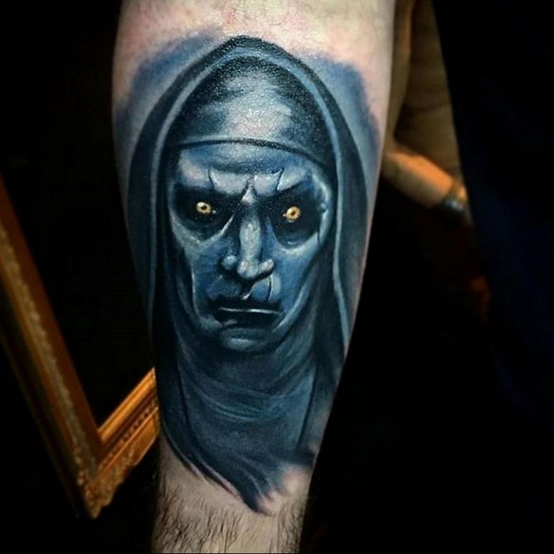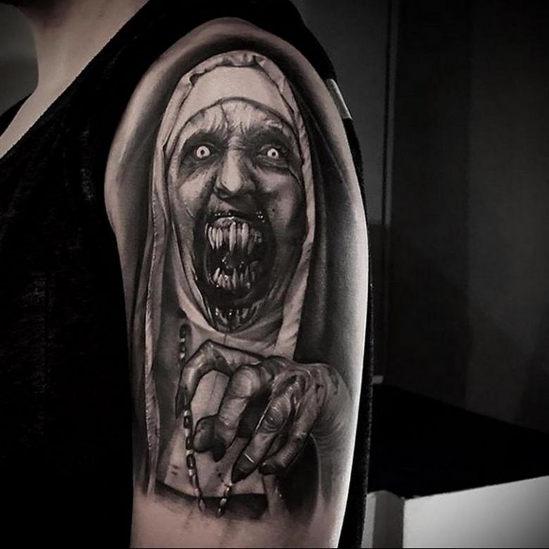 Piękna kobieca twarz w zakonnym płaszczu, z krzyżem i różańcem, w pozie modlitewnej lub z zasłoniętymi oczami, spoglądająca na nas czule z cudzego ciała. Ten szkic na pewno pozostanie w pamięci, ponieważ tatuaż zakonnicy nie jest spotykany zbyt często, ale zawsze jest wykonywany tak zgrabnie i szczegółowo, jak to tylko możliwe. A głęboka wymowa portretu, oprócz przyjemności estetycznej, skłania do refleksji filozoficznej.