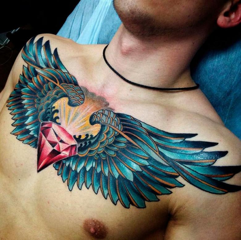 L'aigle - cet oiseau de proie mérite une mention à part, car les aigles sont largement représentés dans de nombreuses cultures : les Sumériens, les Aztèques, les anciens Romains. L'aigle pouvait apporter de bonnes nouvelles et être un guide vers le royaume des morts. L'aigle en vol représente l'indépendance, tandis que ses griffes et ses ailes déployées symbolisent l'agression et l'attaque. Un tatouage avec un aigle a besoin d'assez d'espace pour montrer l'oiseau dans tous ses détails, il fonctionne donc mieux sur la poitrine et les épaules.