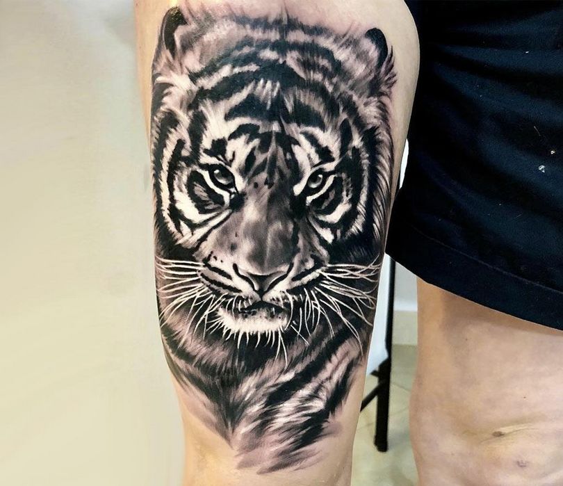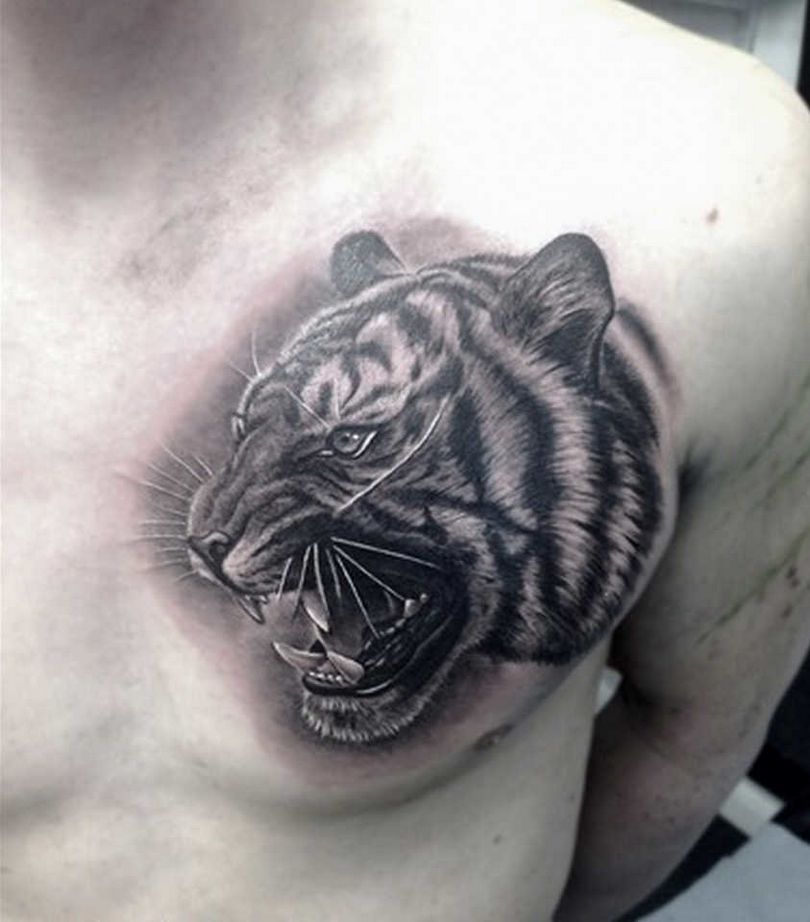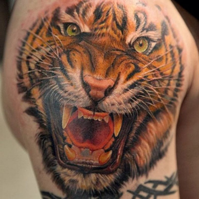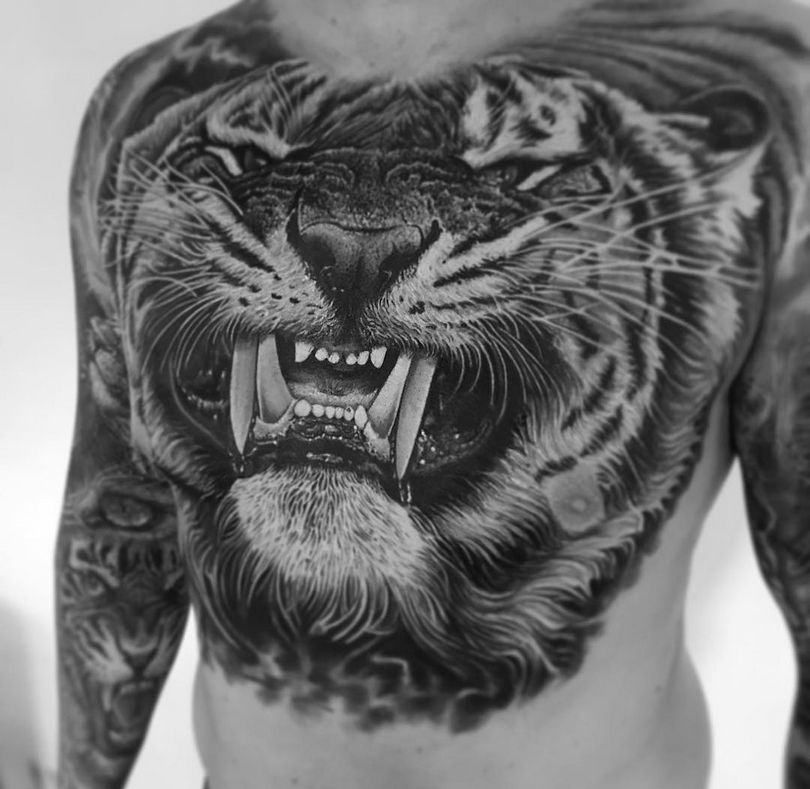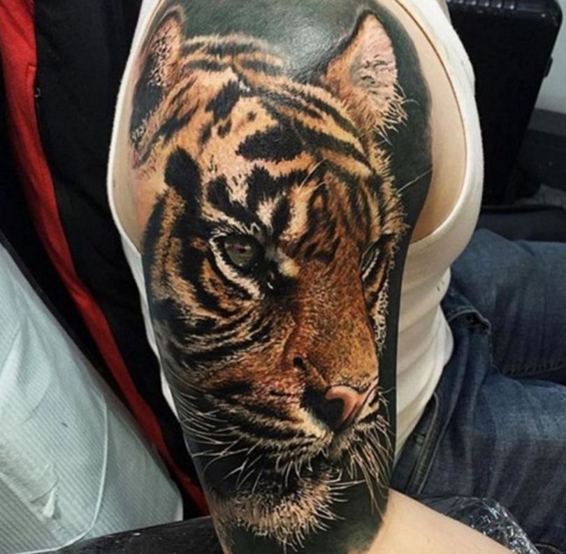Uma tatuagem de um tigre representa um desejo de superioridade, uma demonstração de força da mente e do corpo, agressão inata e majestade. O focinho exposto é uma manifestação animal de força, lados escuros da natureza, subconsciência, onde se encontram as manifestações de carácter mais terríveis e mais fortes. Isto é raiva, malícia, desejo de dominação.