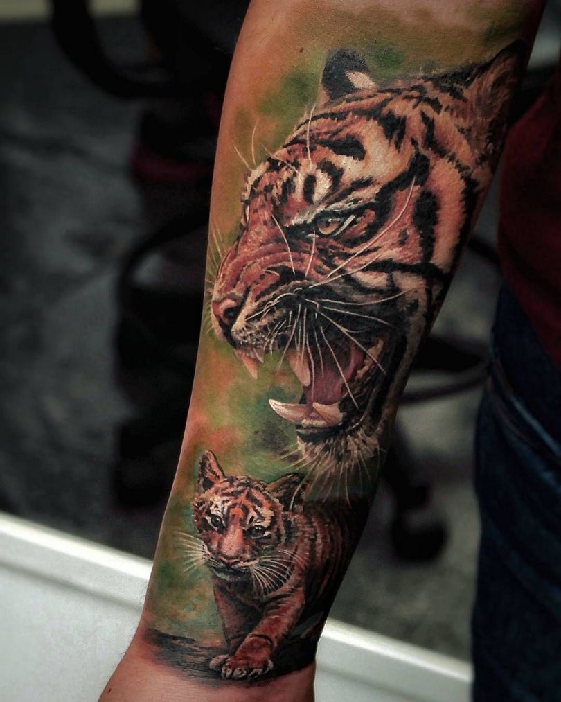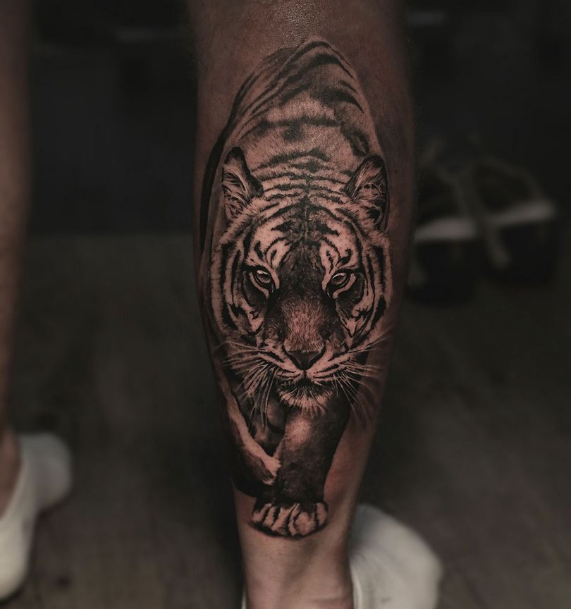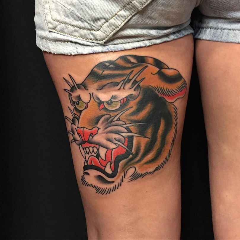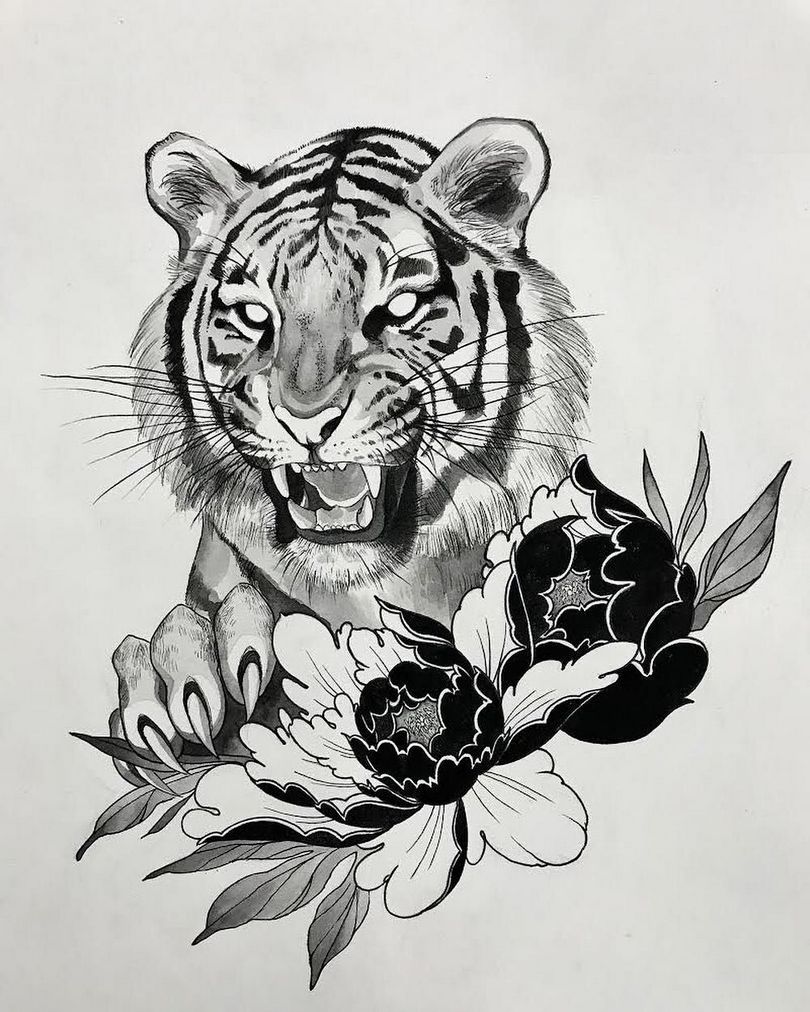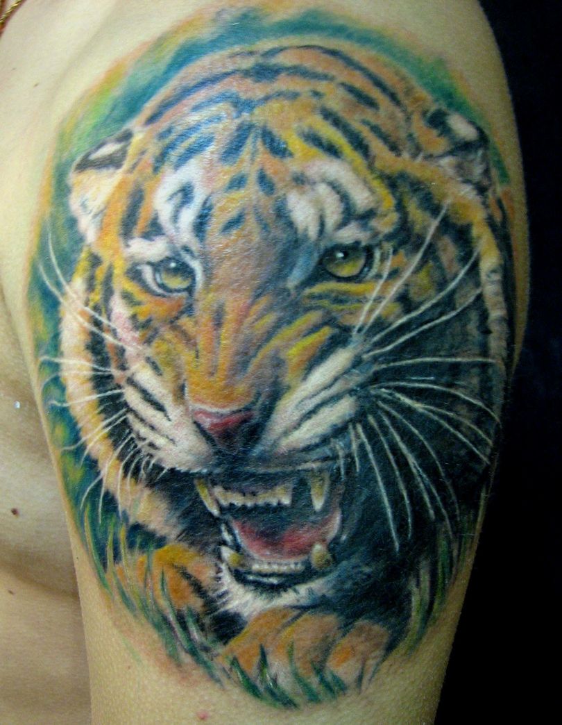 Uma tatuagem de um tigre representa um desejo de superioridade, uma demonstração de força da mente e do corpo, agressão inata e majestade. O focinho exposto é uma manifestação animal de força, lados escuros da natureza, subconsciência, onde se encontram as manifestações de carácter mais terríveis e mais fortes. Isto é raiva, malícia, desejo de dominação.