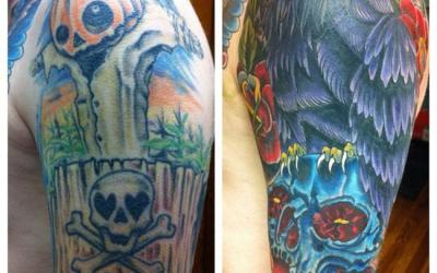 Superposition de tatouages - superposition de vieux tatouages et de cicatrices sur le bras, l'épaule, le poignet, l'abdomen, la poitrine, croquis pour hommes et filles, photos créatives