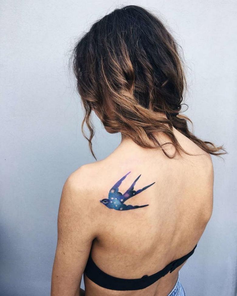 Des paysages au look très impressionnant "écrits à l'aquarelle". Les tatouages à l'aquarelle conviennent aux romantiques et aux passionnés d'art. Vous pouvez peindre presque toutes les parties du corps. Mais la peinture la plus spectaculaire se trouve sur les omoplates ou la zone de la clavicule ;
