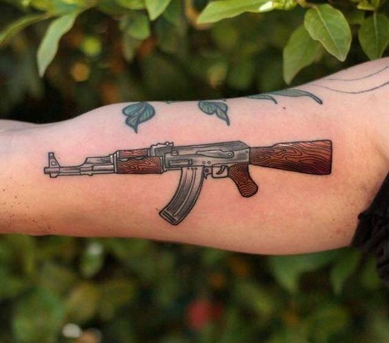 Arma - un simbol al agresivității, al puterii, al pericolului și al capacității oamenilor de a se lupta cu dușmanii lor. Tatuajul cu imaginea unei arme are o varietate de semnificații, dar cel mai adesea arată miezul puternic interior al persoanei.
