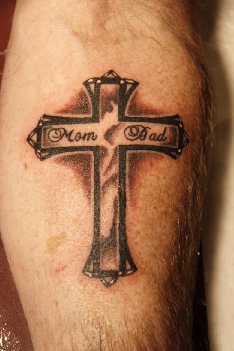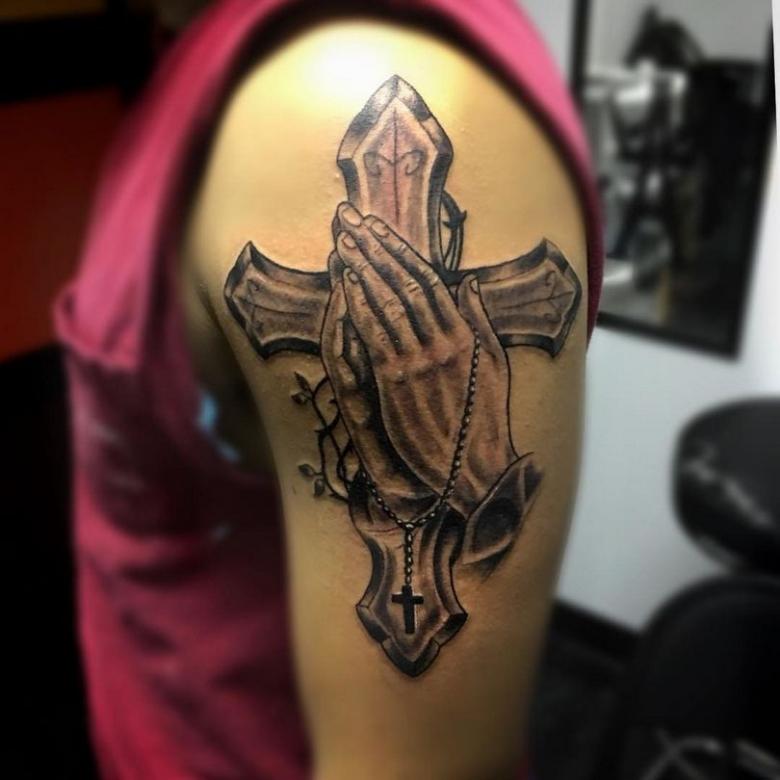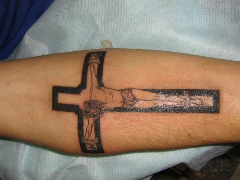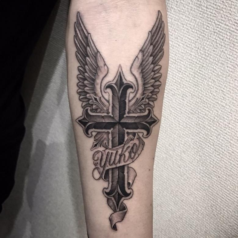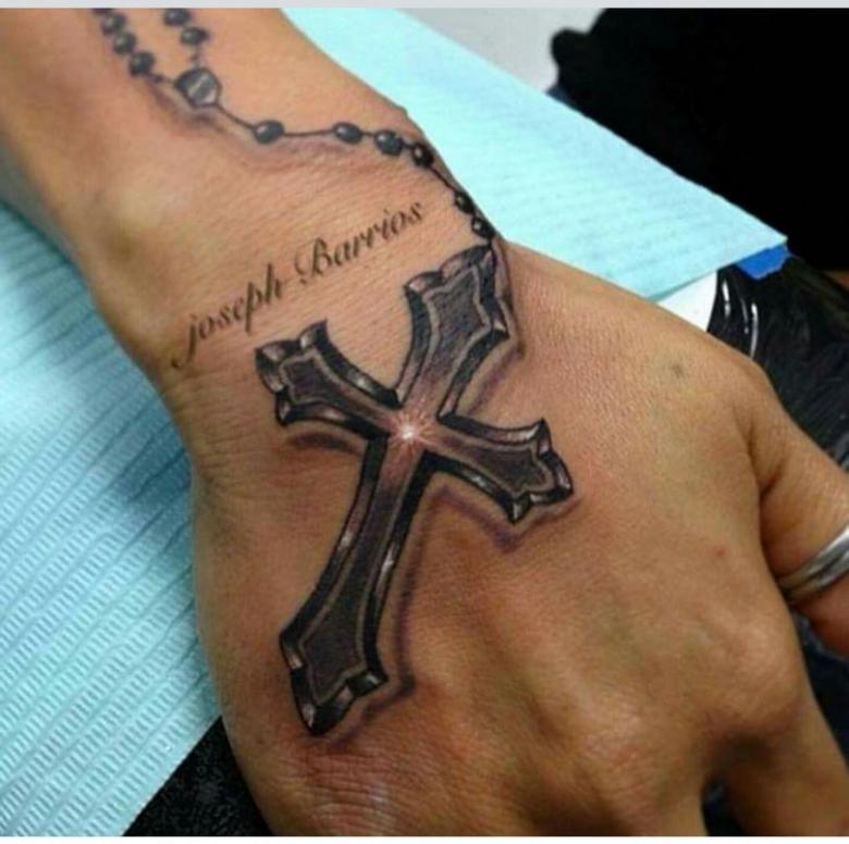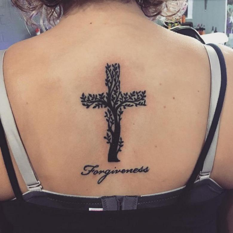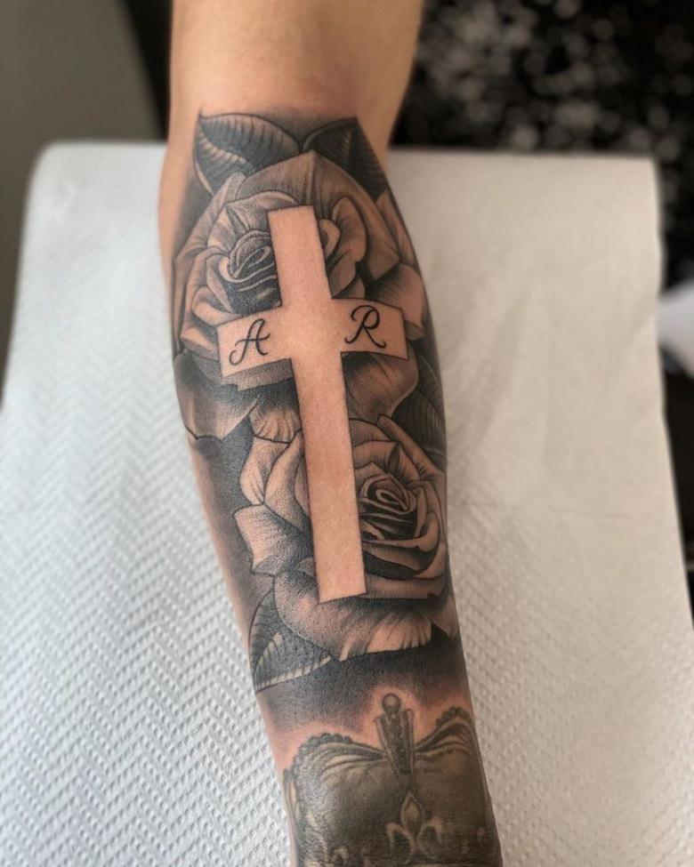 Obraz kríža na tele môže byť doplnený nielen kvetmi a ružami; dobrý remeselník vám pomôže nájsť zaujímavé prvky pre kompozíciu. Môže to byť známy citát v latinčine, obľúbené príslovie alebo ruky zložené na znak prosby, holubice a tŕňový veniec (znak pokánia).