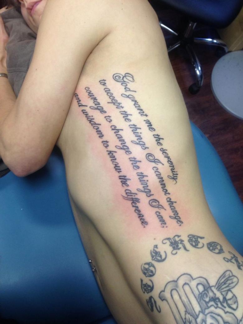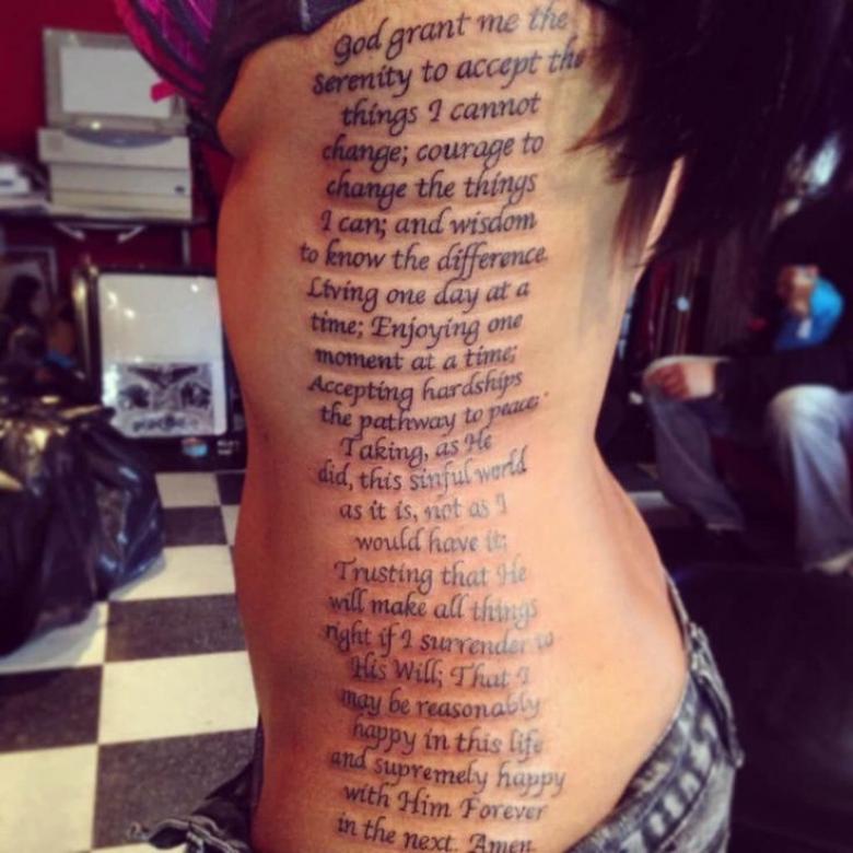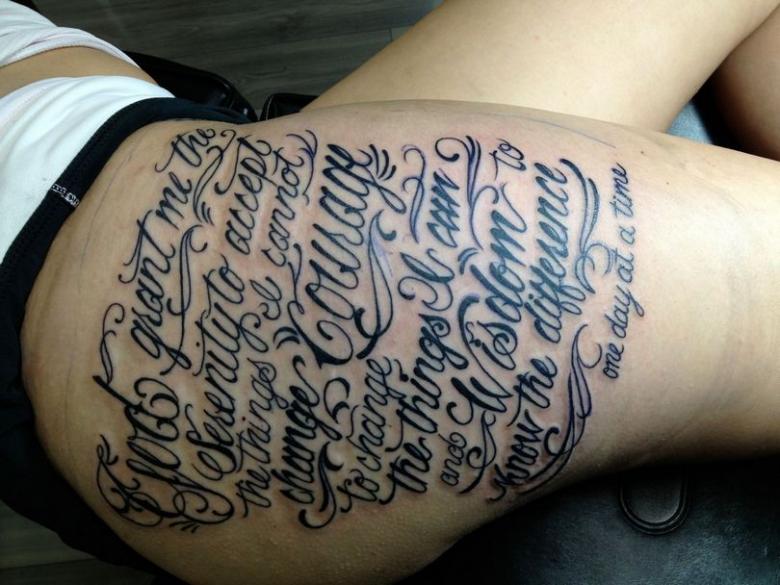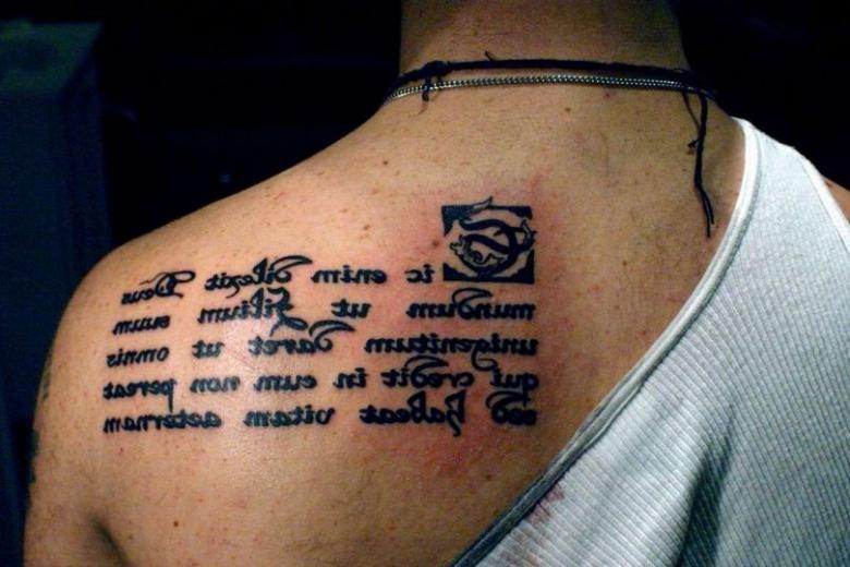 Takšne tetovaže so po možnosti nad pasom. Da se besedilo dobro bere in ne zmoti, ga namestite na hrbet, na lopatico, vzdolž podlakti.