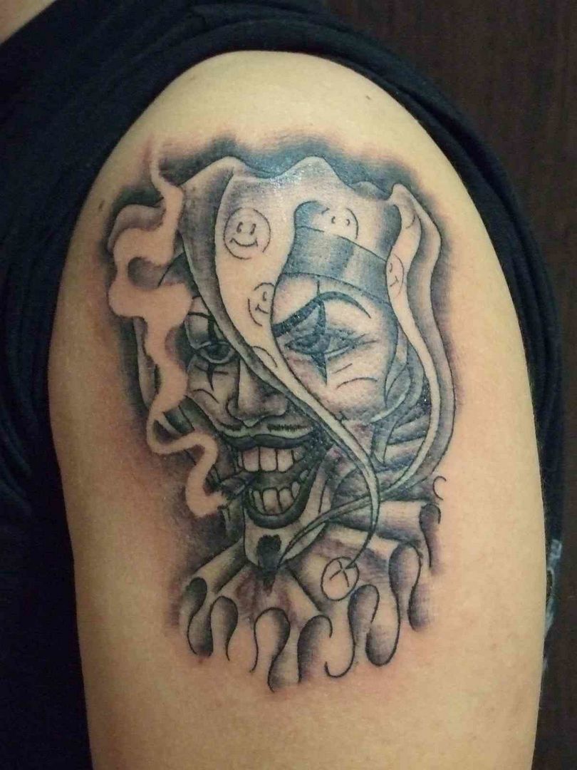 Približno enako simbolizira tetovaža norčka z žalostno masko v roki ali žalostnim ličilom. Maska ali ličila lahko prikrivajo skromnost, negotovost in skrivnostnost.
