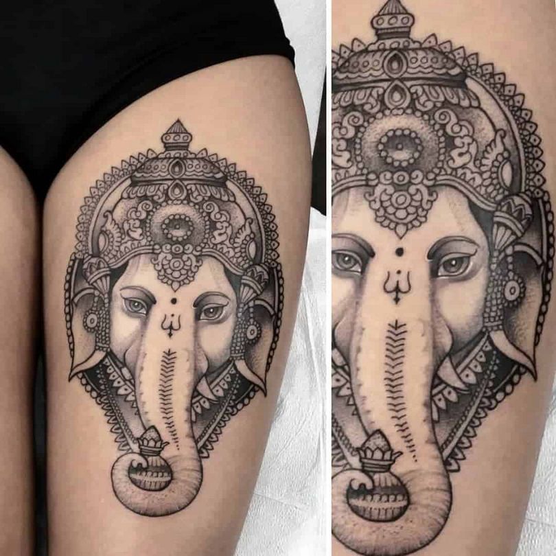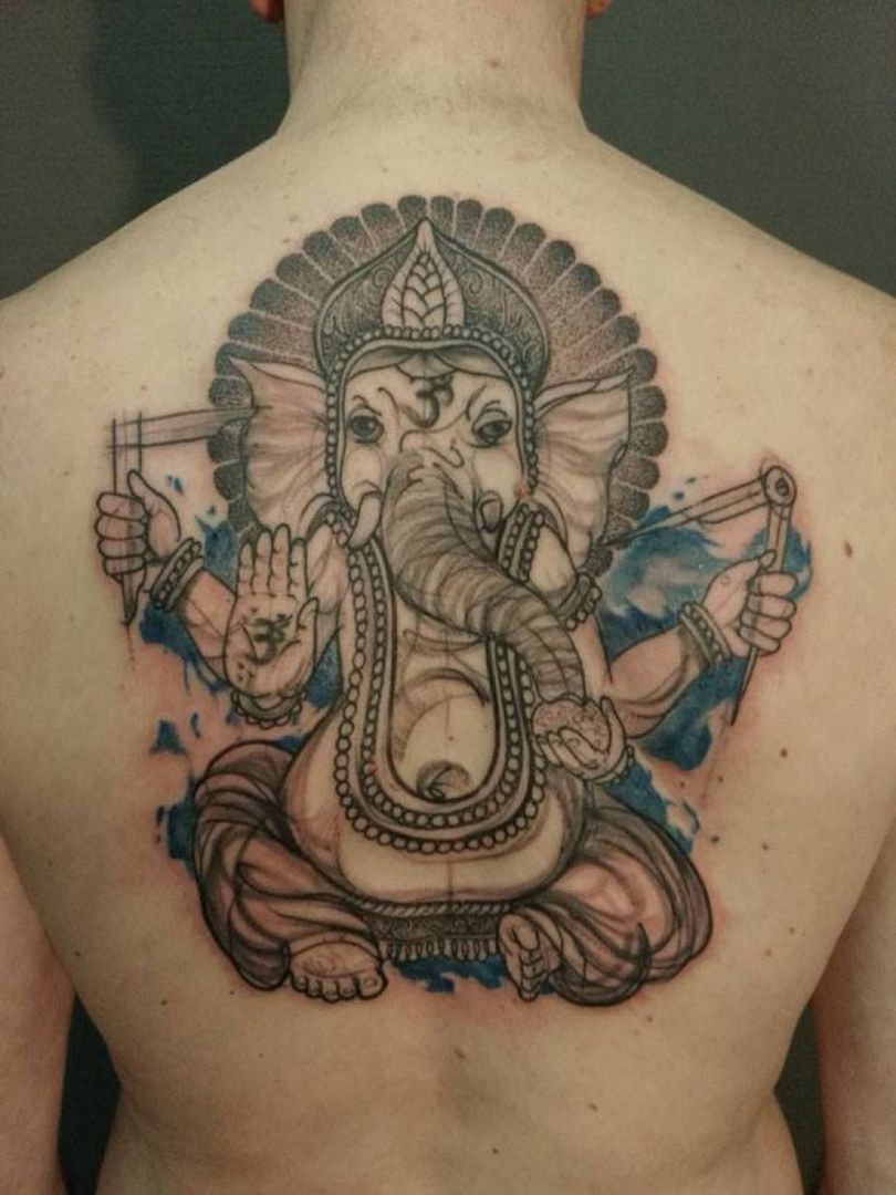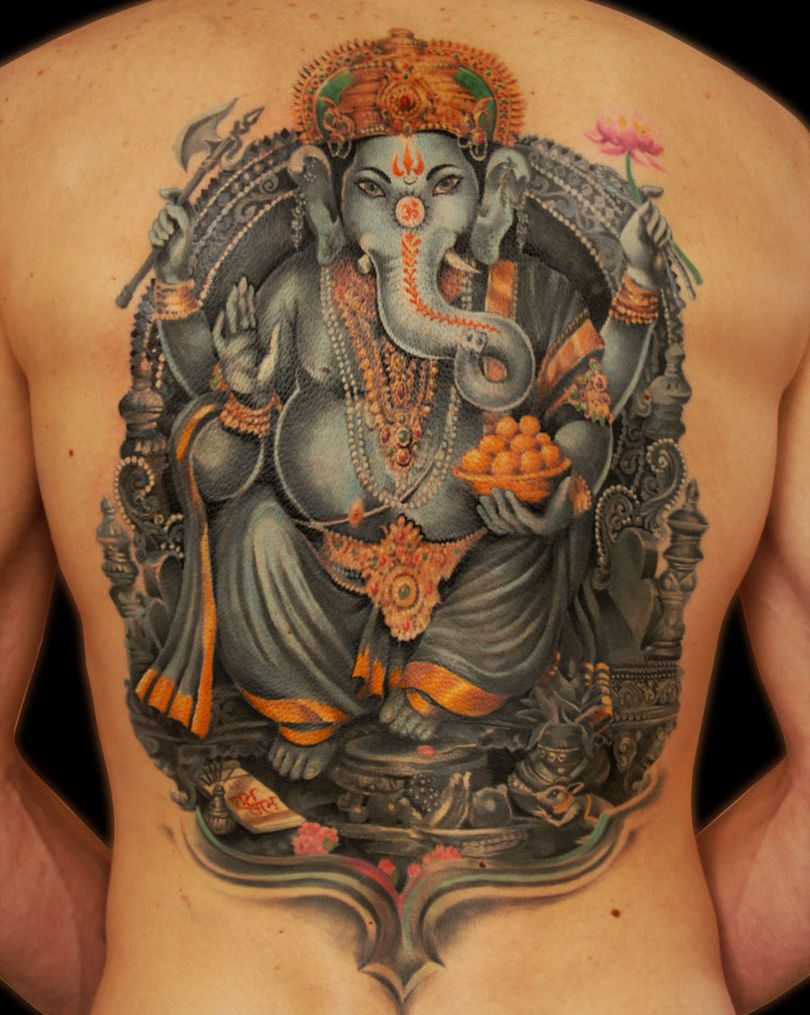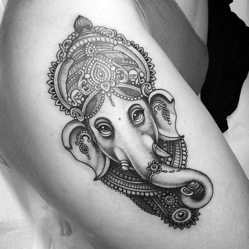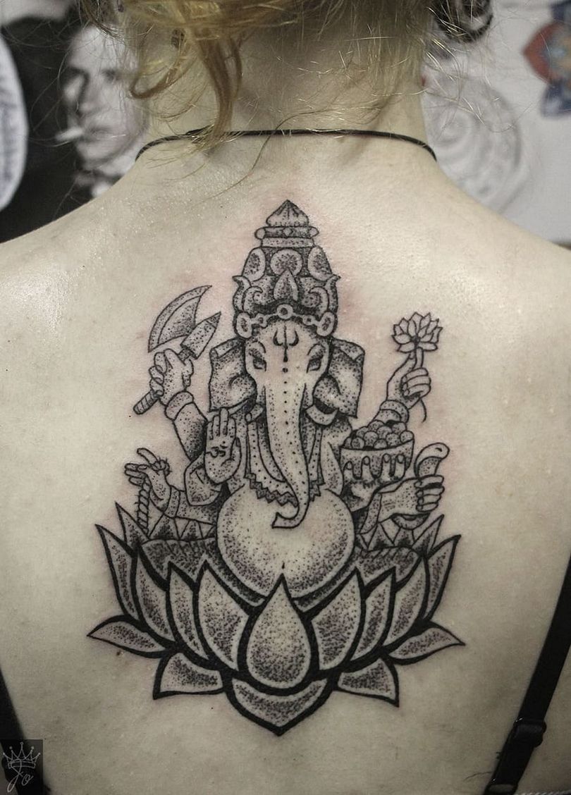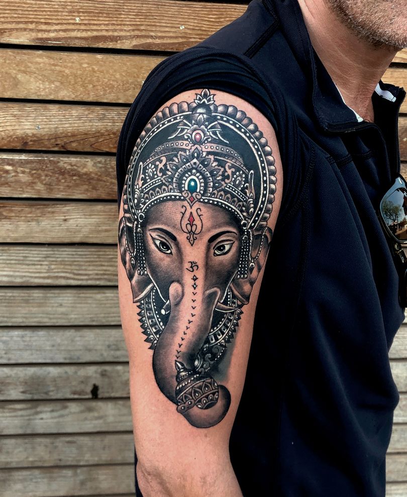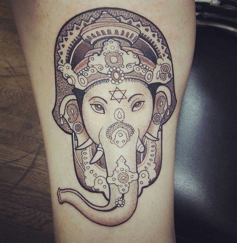 Ganesha-tatueringen symboliserar en ärofull man, en mäktig krigare. Det betyder visdom och förmågan att kommunicera sina tankar till andra. Gudomen förknippas med andlig tillväxt och därför är bilden så populär.