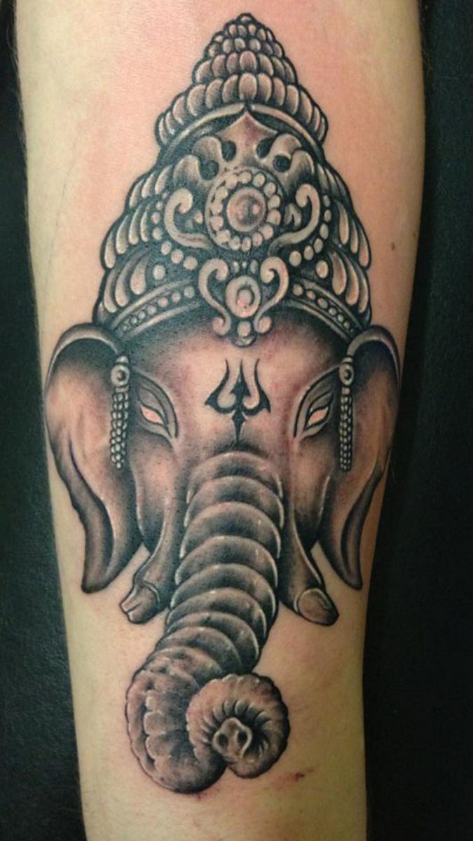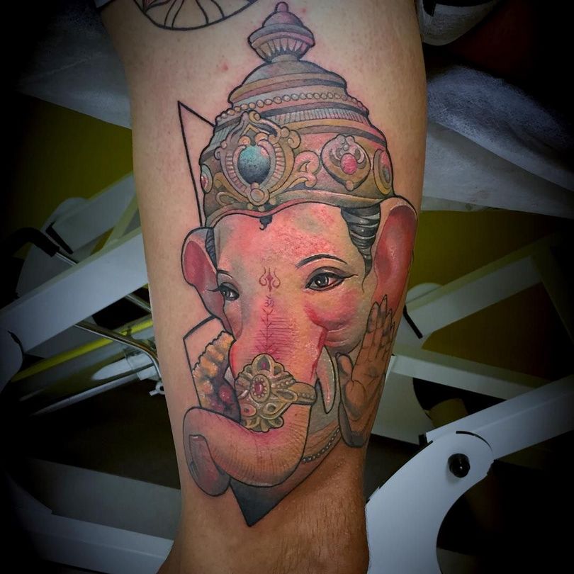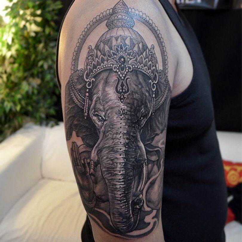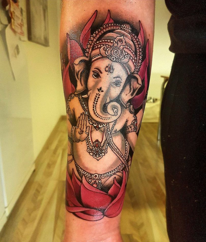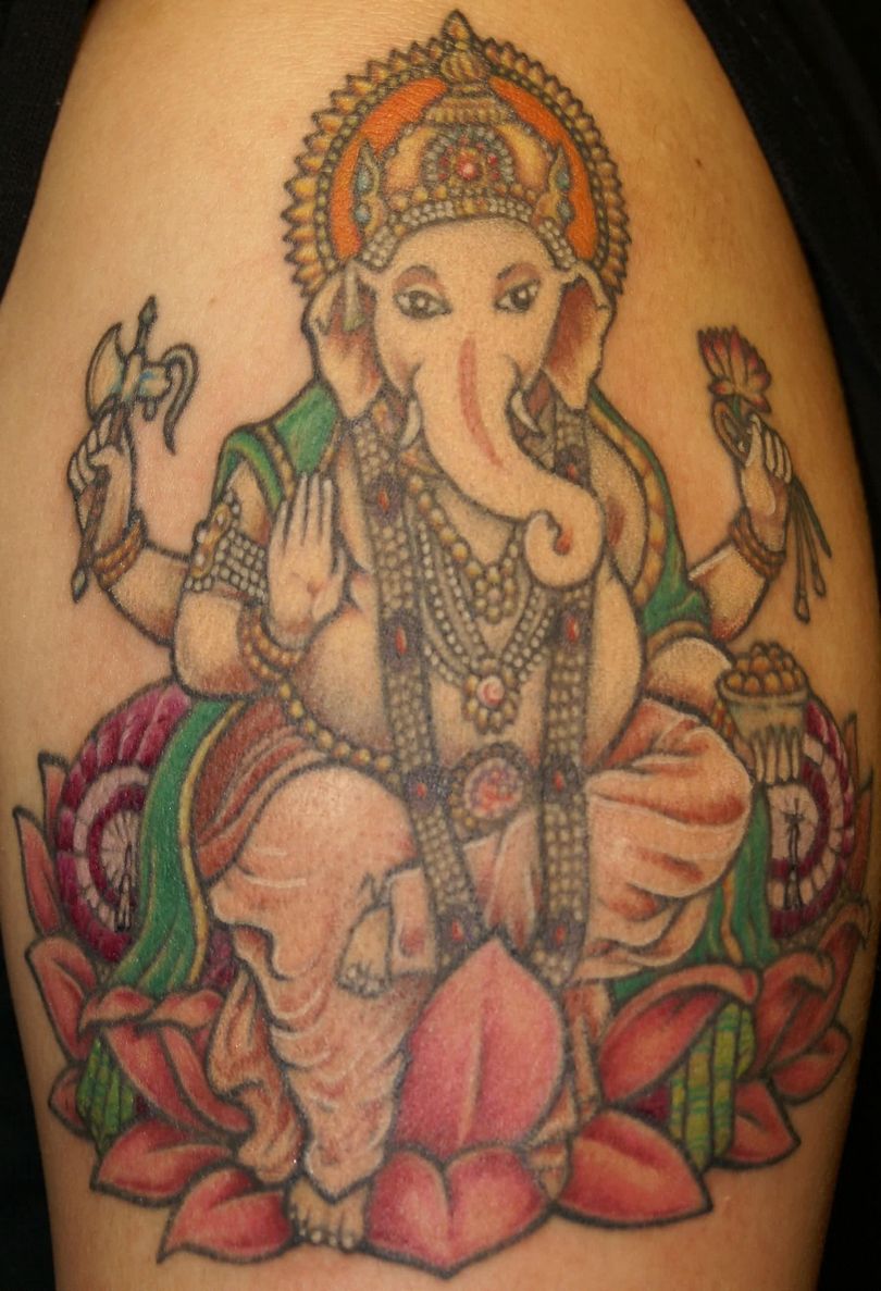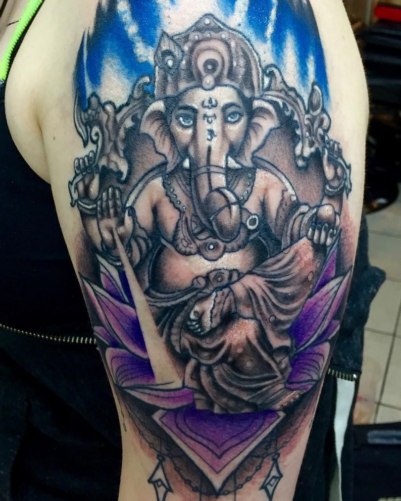 Ganesha-tatueringen symboliserar en ärofull man, en mäktig krigare. Det betyder visdom och förmågan att kommunicera sina tankar till andra. Gudomen förknippas med andlig tillväxt och därför är bilden så populär.